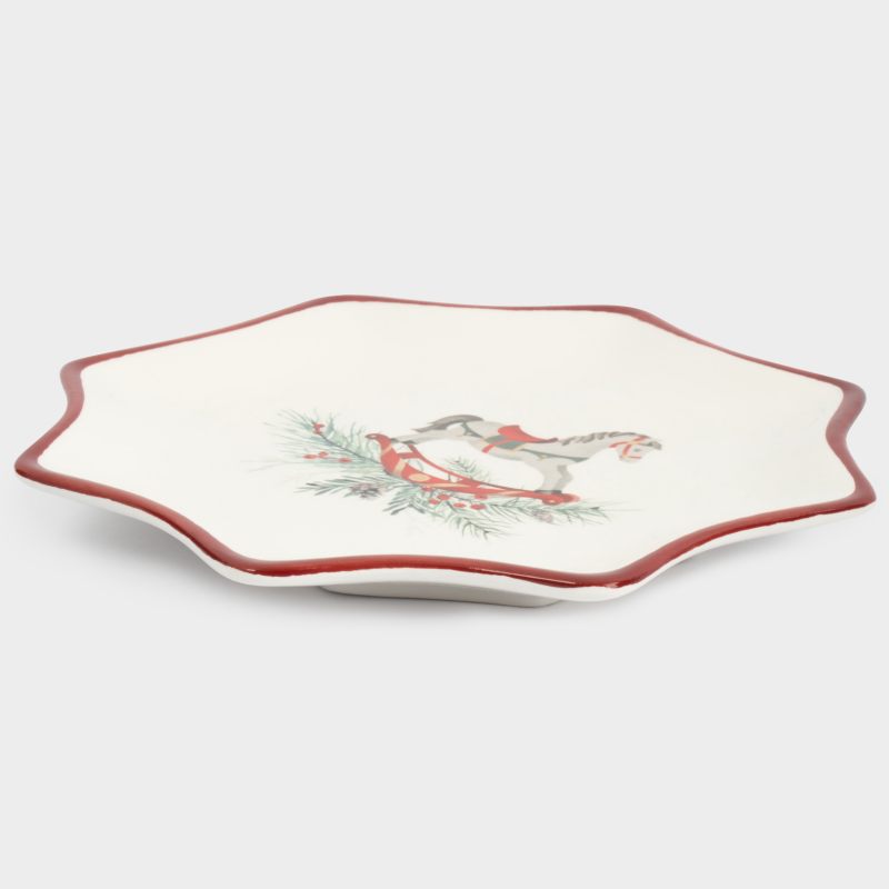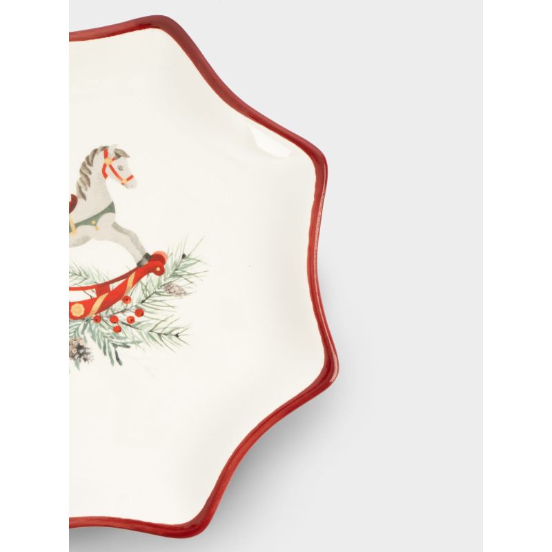 Встретьте 2026 год — год Лошади — стильно и с особым смыслом! Это изысканное блюдо из прочной керамики выполнено в оригинальной форме звезды, символизирующей счастье, удачу и исполнение желаний. Яркий красный цвет добавит тепла и энергии новогоднему столу, а изображение грациозной лошадки станет талисманом года, привлекающим благополучие и успех.