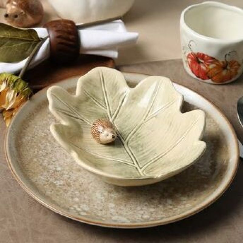 Нежный зеленый оттенок фона гармонично сочетается с детализированной фигуркой ежика, расположившегося на большом листе. Этот предмет сервировки не просто функционален — он создает особое настроение, наполняя пространство теплом и уютом.