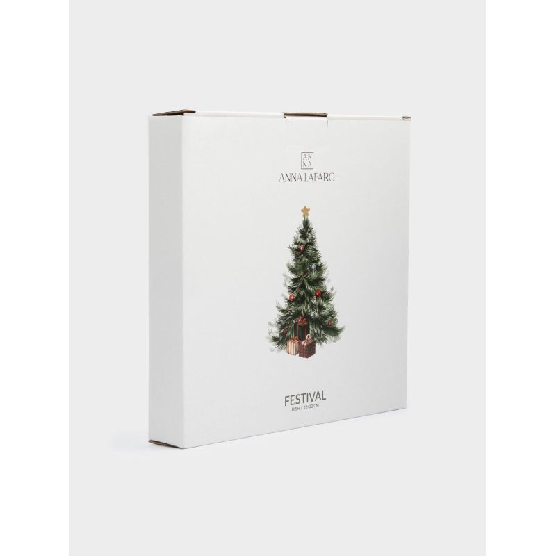 Праздничный узор с изображением нарядной ёлки и подарков превращает обычное блюдо в произведение искусства. Каждый элемент декора проработан с особой тщательностью, что придаёт изделию особую изысканность и шарм.