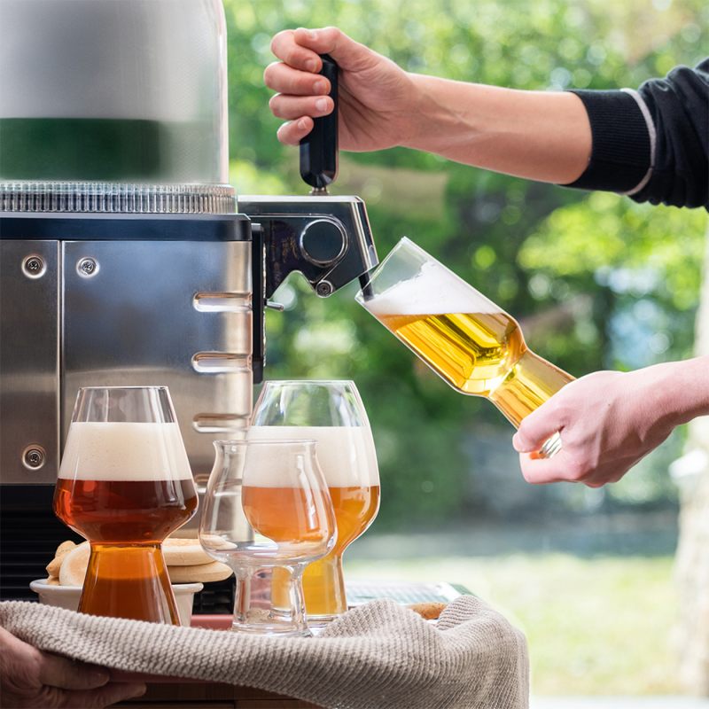 Линейная форма, представляющая собой научный взгляд на классическое цилиндрическое стекло, сочетает в себе неформальность и передовые технологии: массивная ножка контрастирует с утончённым ободком, что делает этот бокал идеальным инструментом для повседневного использования. В пилснере подчёркивается плотность пены и характерные ароматы, особенно цитрусовых, которые в противном случае могли бы остаться незамеченными. Лазерное травление у основания обеспечивает непрерывное выделение небольшого количества мелких пузырьков, которые пополняют головку и одновременно раскрывают аромат.