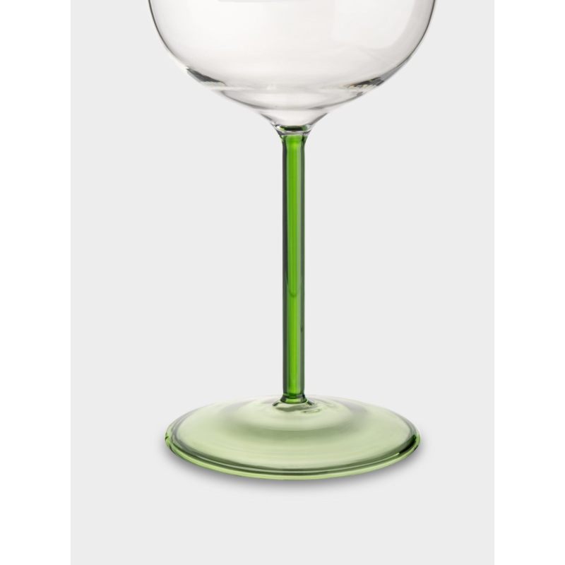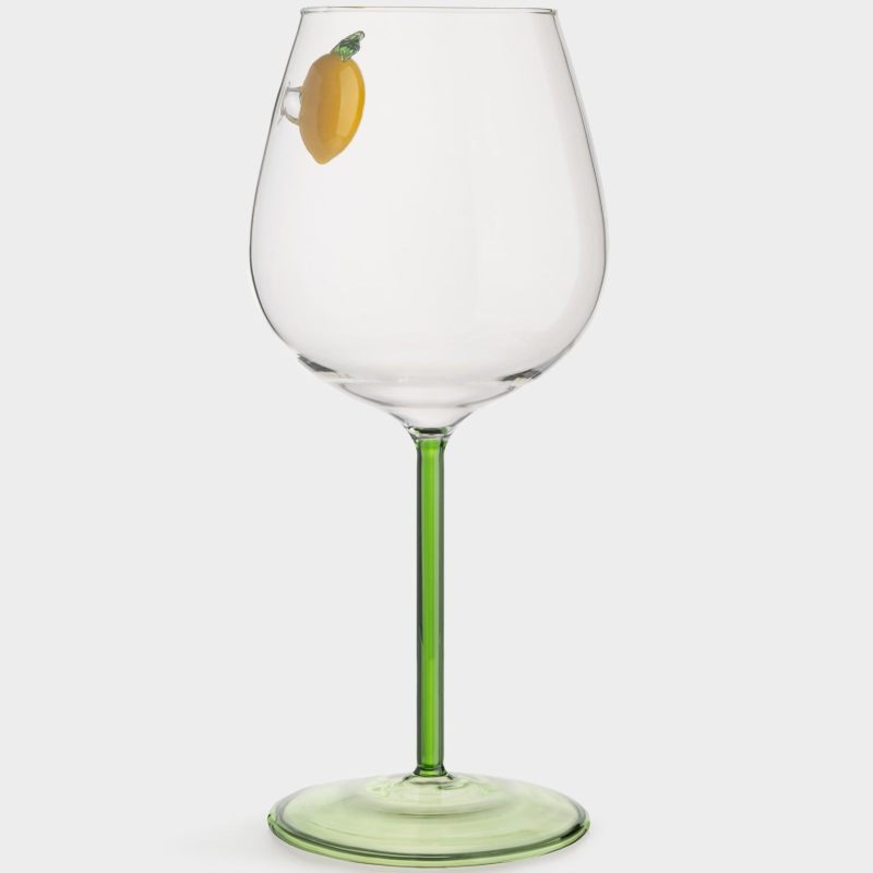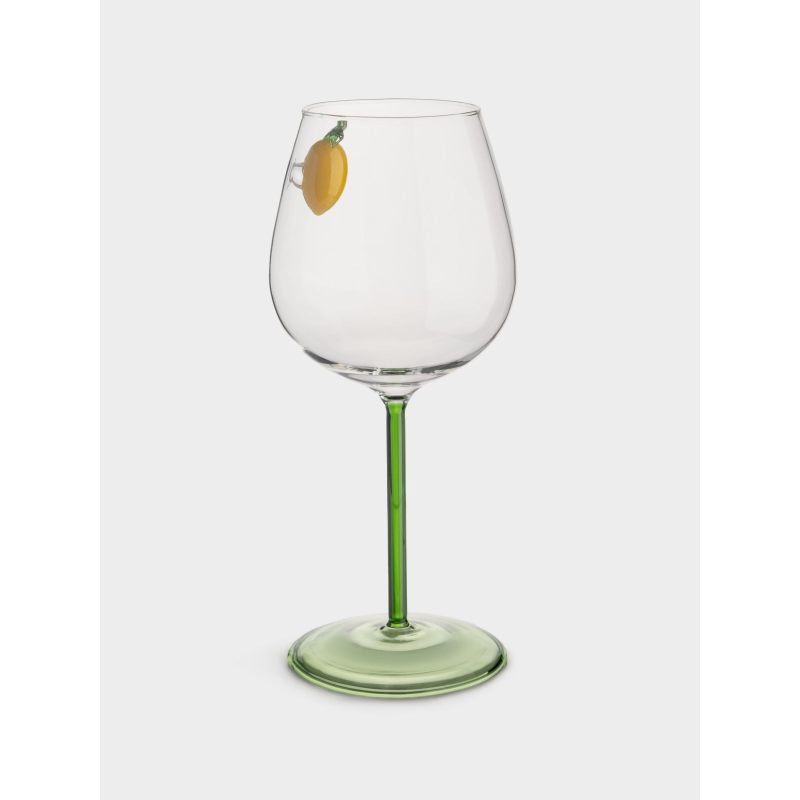 Зелёная ножка и основание бокала создают гармоничное цветовое сочетание с лимонным декором, навевая ассоциации с сочными цитрусовыми садами и свежестью весеннего утра. Объём идеально подходит для полноценного наслаждения ароматом и вкусом любимого вина — от лёгких белых до насыщенных красных сортов.