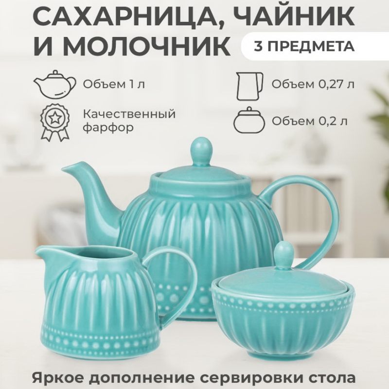 Набор для чаепития "Beautiful patterns" — бирюзовое вдохновение для вашего стола. Подарите себе или близким минуты настоящего эстетического удовольствия с эксклюзивным набором для чаепития "Beautiful patterns". В комплект входят элегантный чайник, изящная сахарница и утончённый молочник — всё выполнено из высококачественного фарфора премиум-класса.