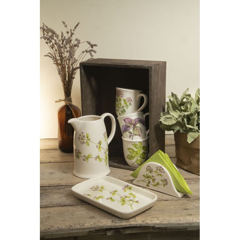 Коллекция "Rosemary" от итальянского бренда Nuova Cer — это сочетание сдержанной элегантности и свежесть средиземноморья на вашей кухне. Каждое изделие выполнено из высококачественной керамики и покрыто мягкой матовой глазурью в палитре шалфейного зелёного, кремового и песочного. Нежный узор из листочков розмарина наносится вручную, поэтому каждая тарелка и чашка уникальны по текстуре и рисунку.