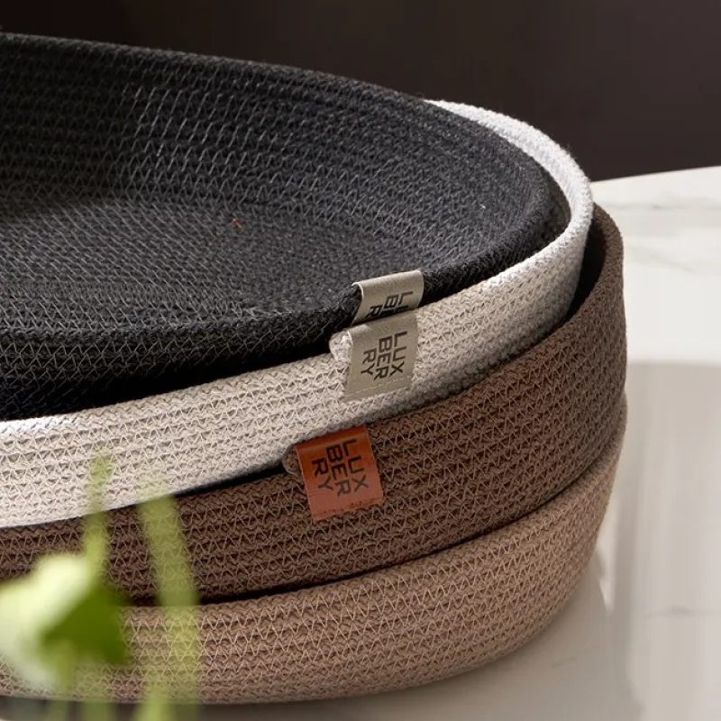 Декоративная корзиночка "BOHO" выполнена из 100% хлопкового шнура, пришивной лэйбл "LUXBERRY" из искусственной кожи.