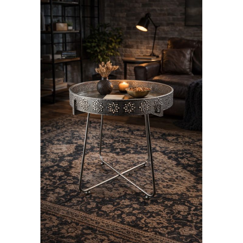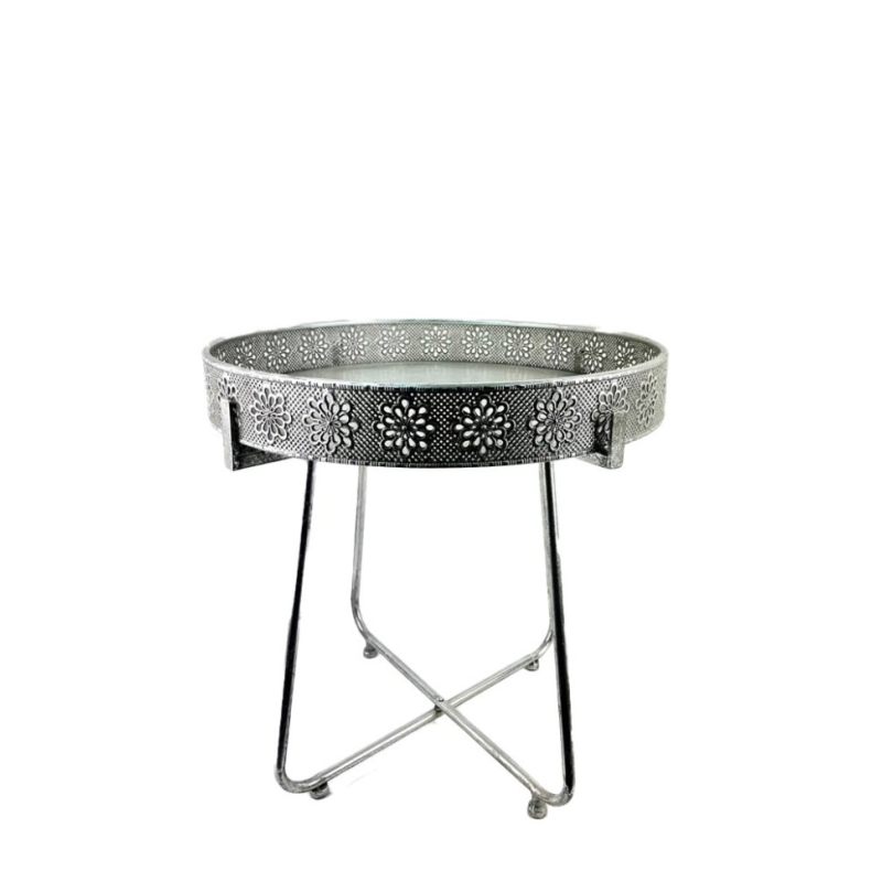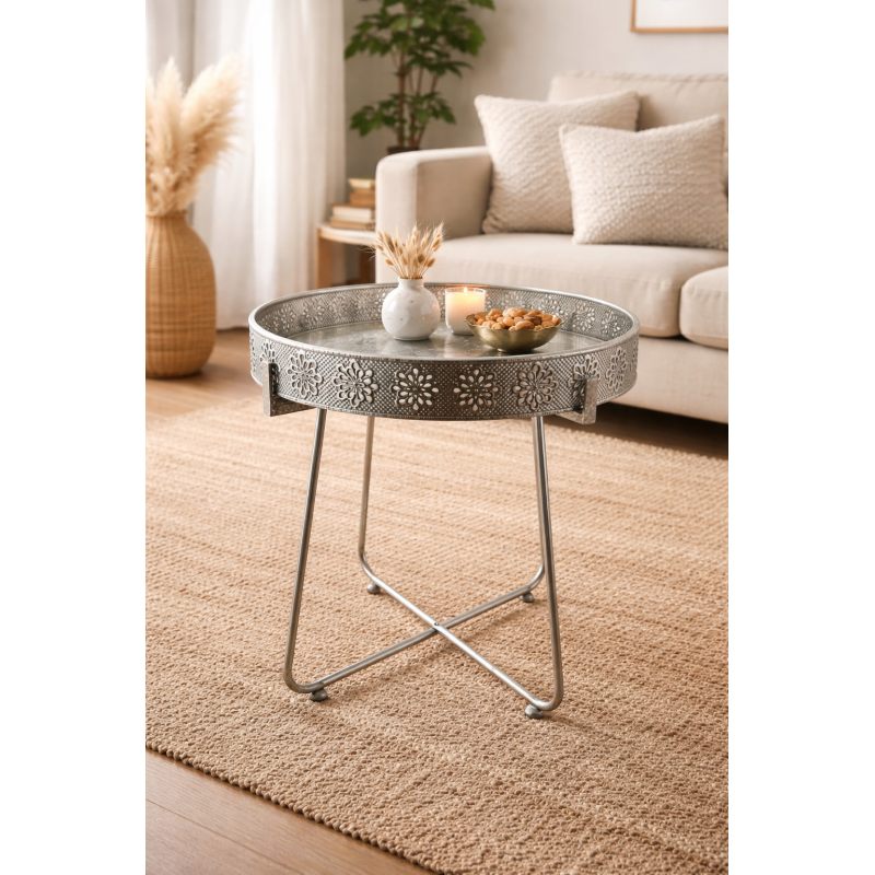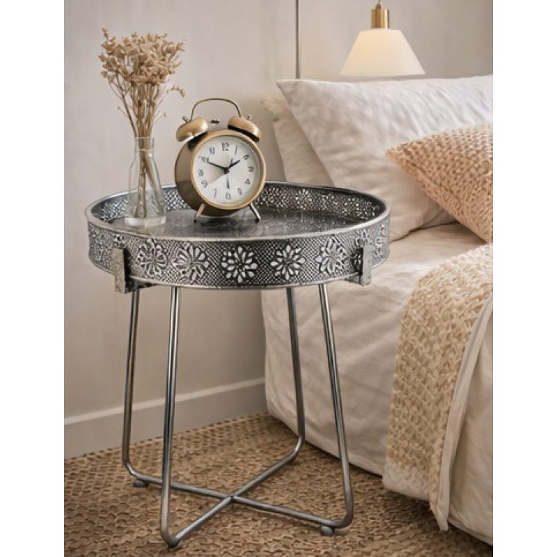 Добавьте изысканный акцент в ваш интерьер с помощью этого элегантного металлического столика. Сочетание лаконичной формы и утончённого декора делает его идеальным элементом для гостиной, спальни или зоны отдыха.