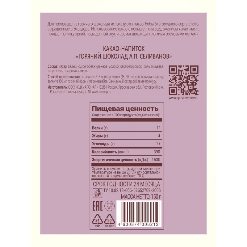 Для производства горячего шоколада используются какао-бобы благородного сорта Criollo, выращенные в Эквадоре. Использование какао с повышенным содержанием какао-масла не менее 30% придает напитку яркий, насыщенный вкус и аромат шоколада с легкими ореховыми нотками. Не содержит ГМО.