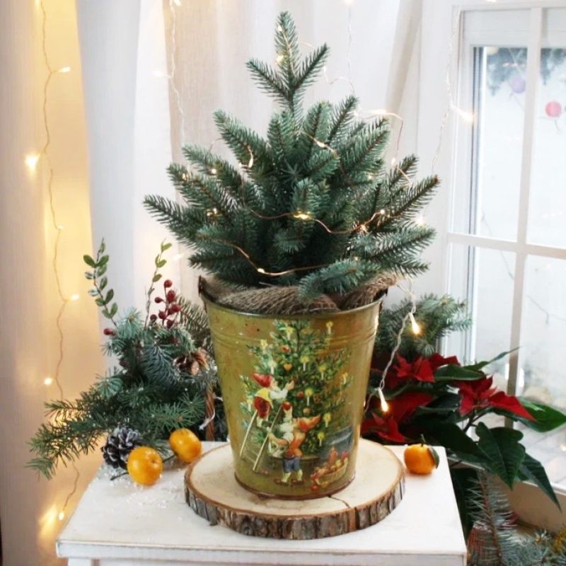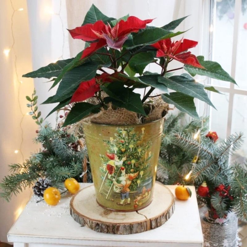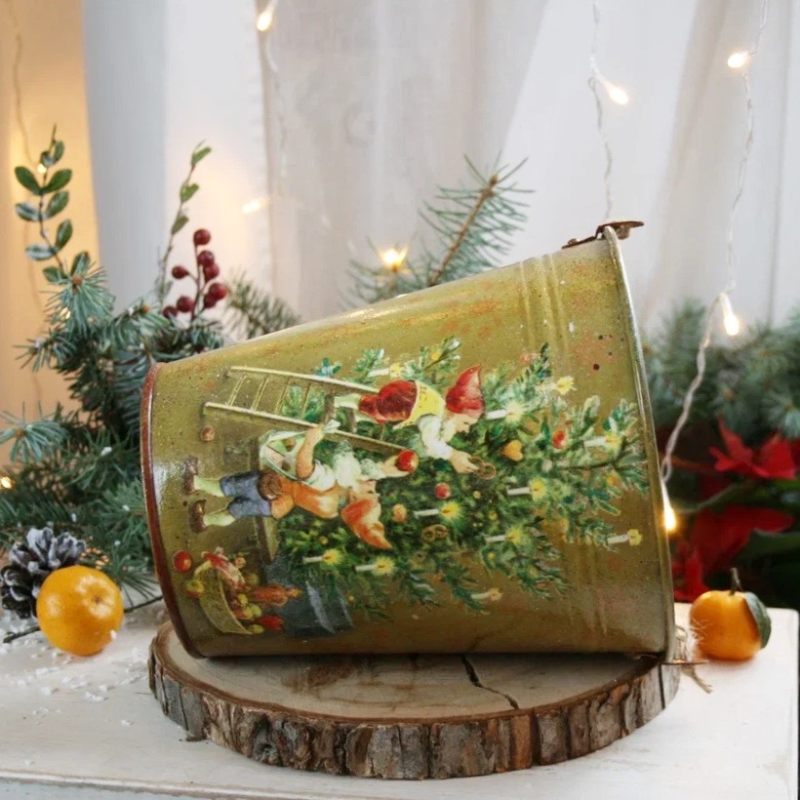 Металлическое кашпо ведёрко выполнено в технике декупаж. Можно использовать как кашпо под небольшую елочку, пуансеттию или новогодние композиции.