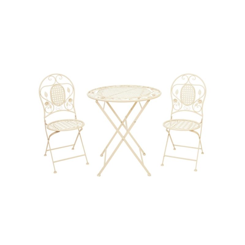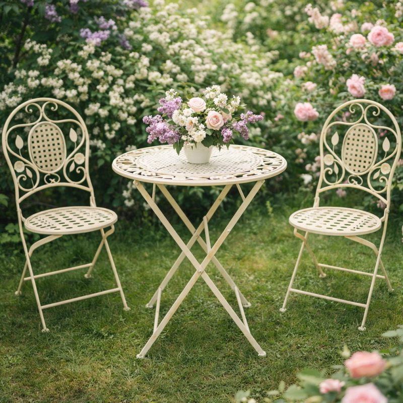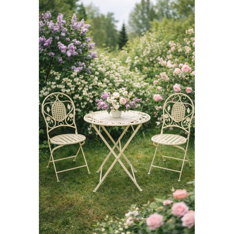 Окунитесь в атмосферу французского Прованса с этим изящным садовым гарнитуром! Комплект состоит из круглого металлического столика и двух складных стульев, выполненных в едином стиле. Лёгкая кремовая окраска и ажурные элементы дизайна придают мебели утончённость и романтичность, идеально вписываясь в ландшафт цветущего сада.