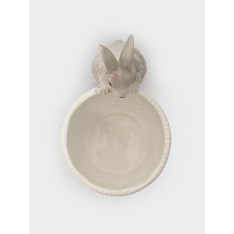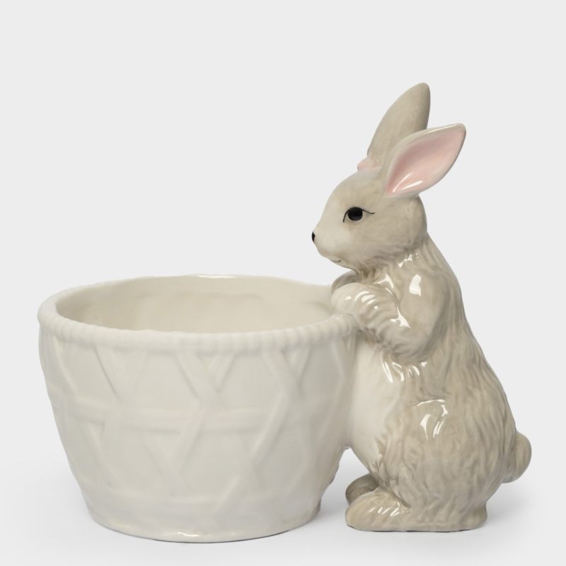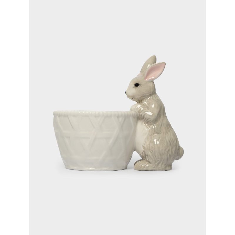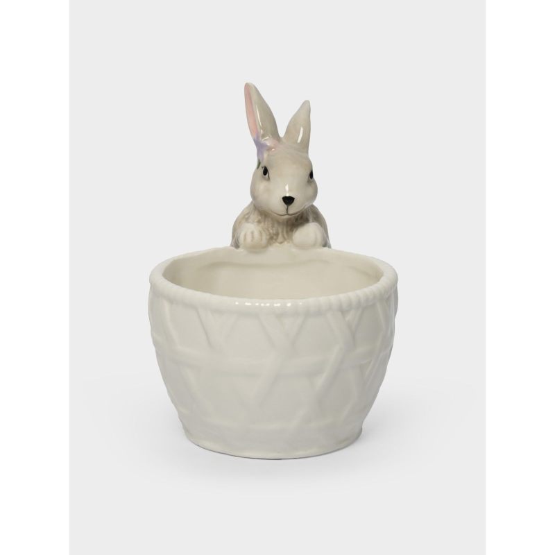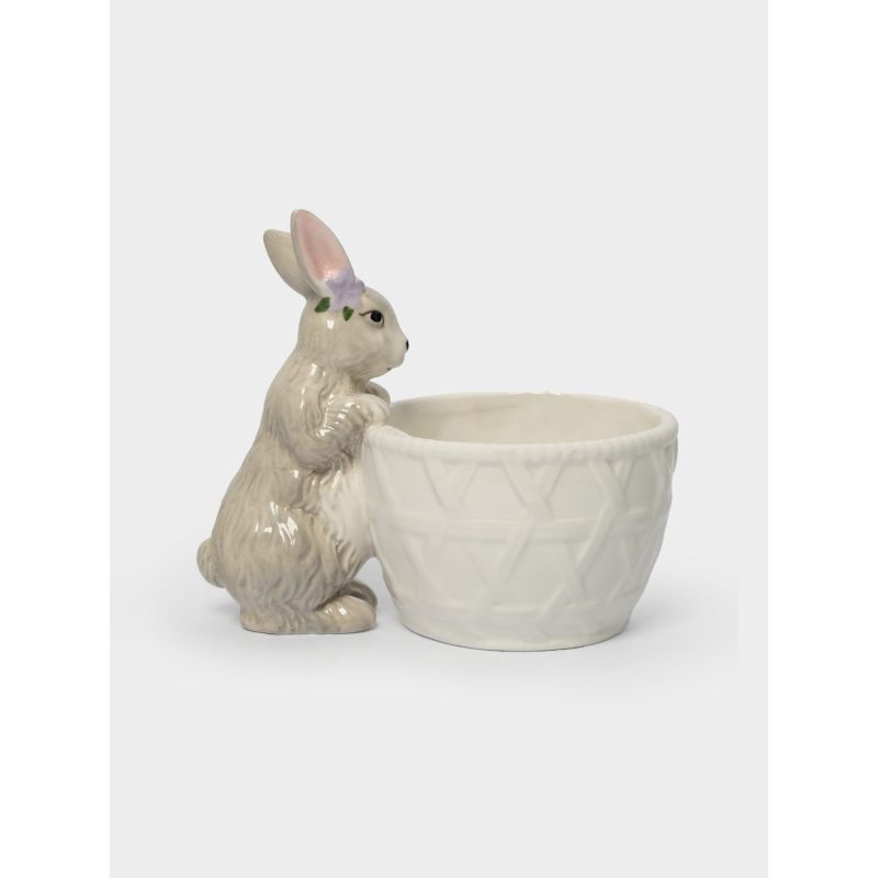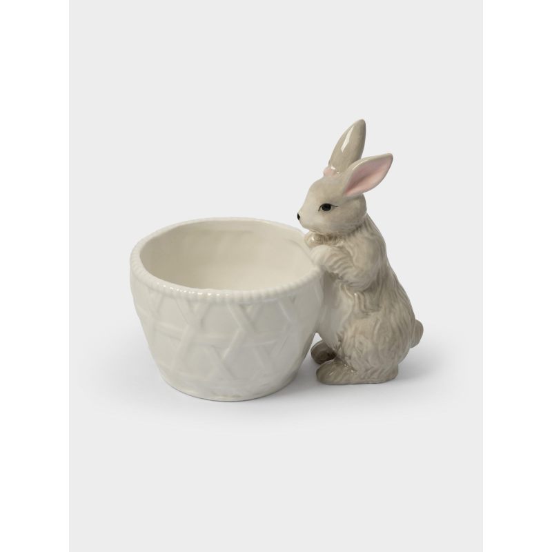 Эта изящная керамическая конфетница словно создана самой природой: миловидный кролик с выразительными глазками и пушистыми ушками аккуратно «держит» корзинку, будто приглашает окунуться в атмосферу весеннего пробуждения. Текстурированный узор на стенках корзинки напоминает плетёную лозочку — отсылка к традиционным пасхальным корзинам, наполненным угощениями.