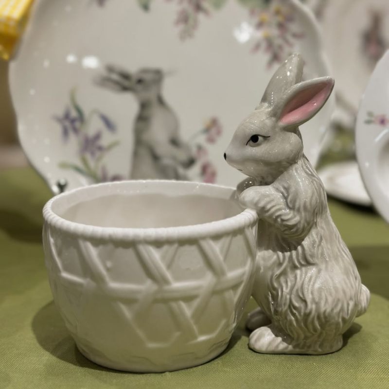 Нежные пастельные оттенки фигурки кролика гармонично сочетаются с белоснежной керамикой, создавая ощущение лёгкости и свежести — как первые весенние цветы, пробивающиеся сквозь землю. Компактный размер делает конфетницу одновременно практичной и уютной: в ней прекрасно разместятся: