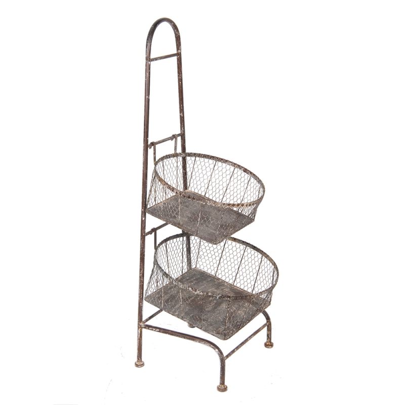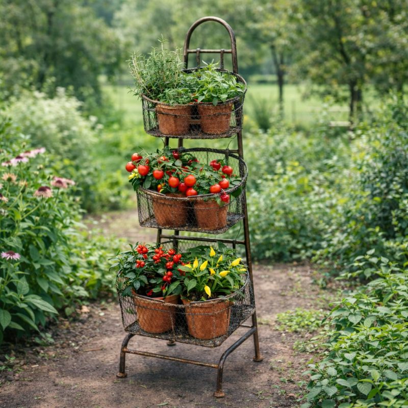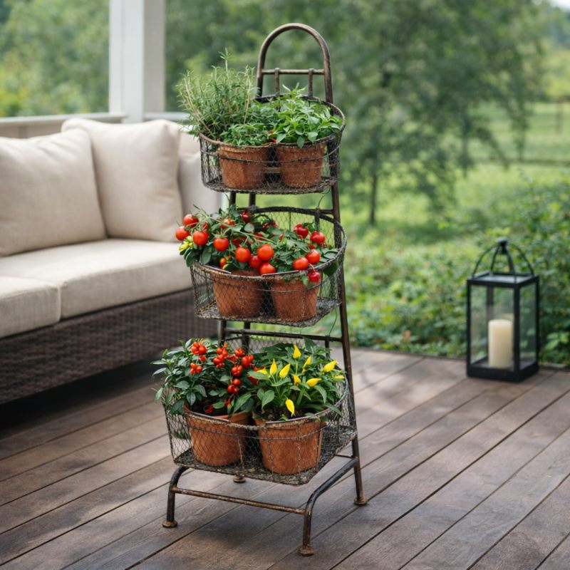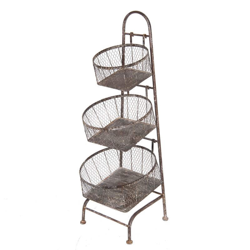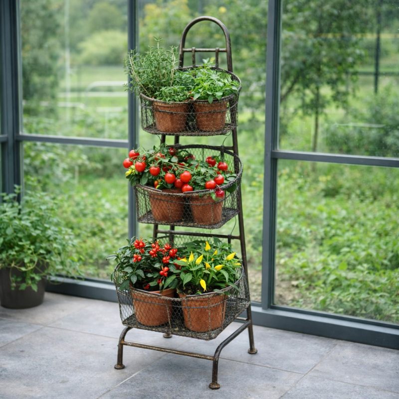 Трёхъярусная металлическая этажерка с корзинами (цветочница) для размещения растении и хранения овощей и фруктов.