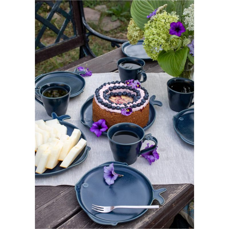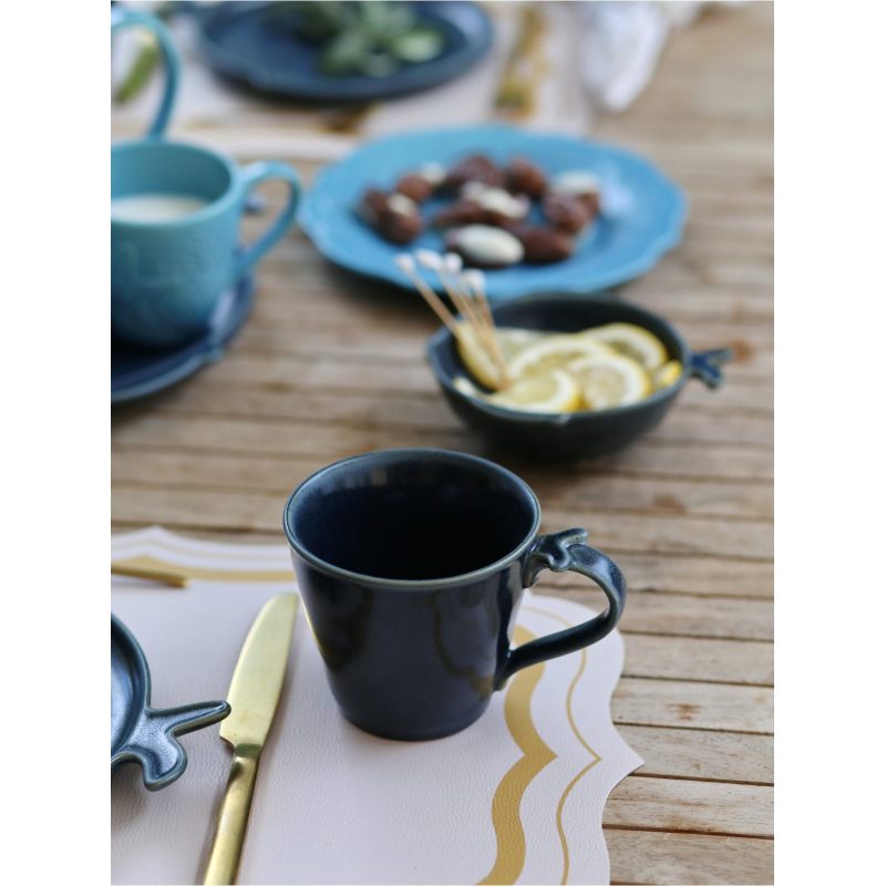 Кружка изготовлена из фарфора темно-синего цвета, перекликающегося с цветом морской воды на большой глубине.