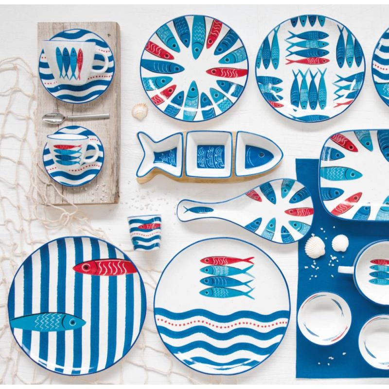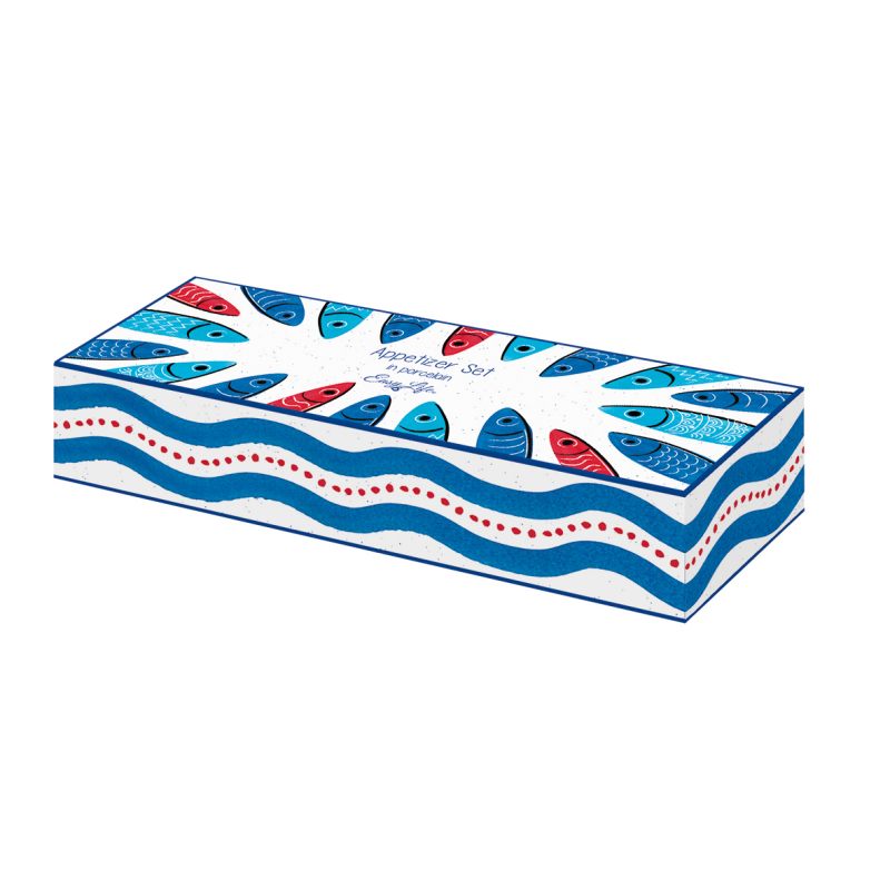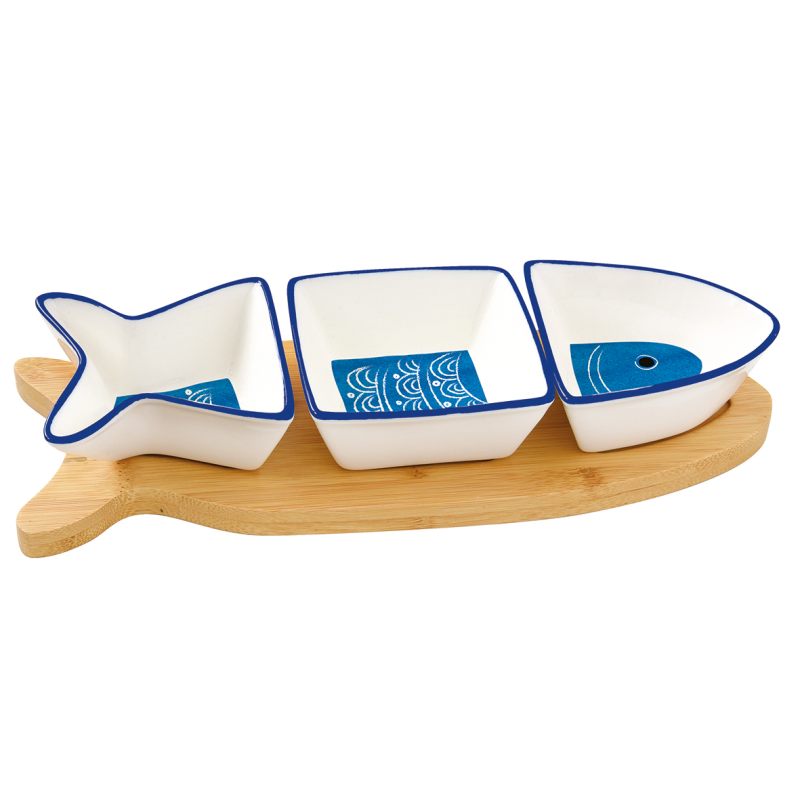 Прохладная свежесть морской воды и легкое дуновение бриза... Набор из для закусок "SARDINE`S PARTY"с легкостью поможет создать Вам атмосферу жарких стран. Это оригинальный предмет декора, наполняющий Ваш дом свежестью ветра, дующего с моря, и ароматом соленого воздуха. Набор состоит из 3 чаш в форме рыбок и бамбукового подноса. Чаши изготовлены из белого фарфора и украшены изображениями 4 рыбок синего и красного цвета. Набор имеет подарочную упаковку. Создайте неповторимую атмосферу в Вашем доме вместе с нашим интернет-магазином!