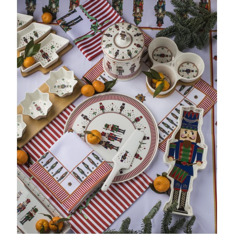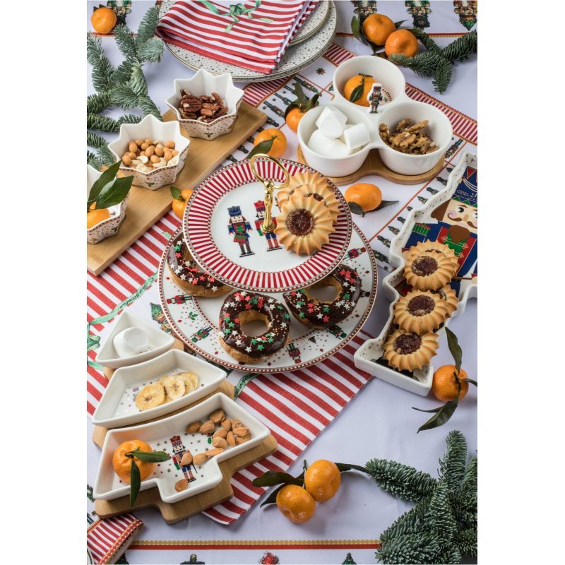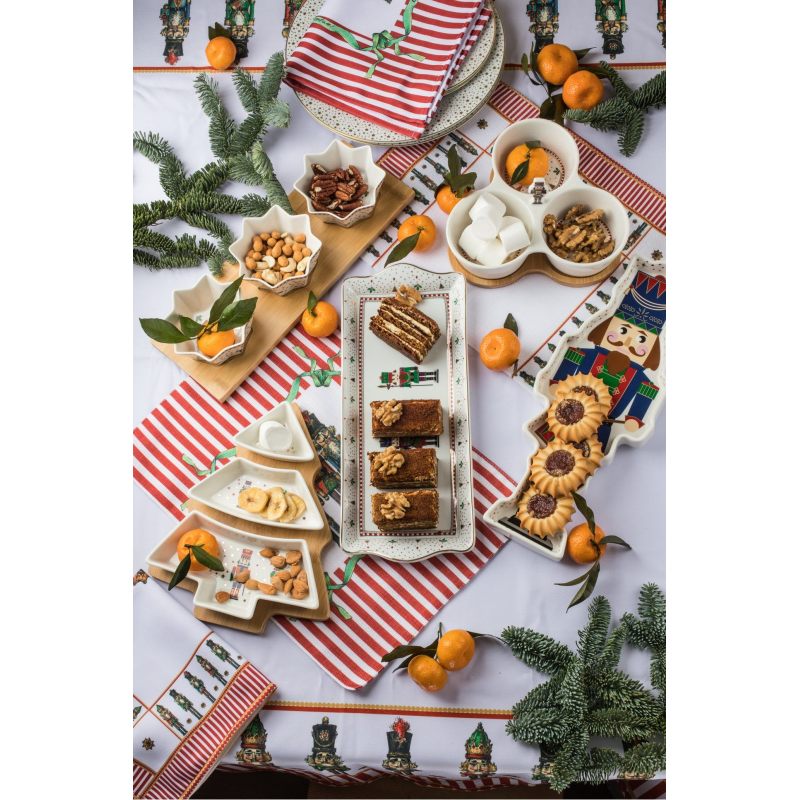 Набор для закусок "NUTCRACKERS" с эффектным рисунком создаст новогоднее настроение и украсит Ваш праздничный стол. Набор представляет собой три чаши, соединенные между собой. Место соединения украшено фигуркой в виде Щелкунчика. Чаши изготовлены из высококачественного белого фарфора, украшены изображениями сказочных Щелкунчиков и новогодних атрибутов. Милые фигурки Щелкунчиков поднимают настроение и создают атмосферу новогоднего волшебства. Чаши располагаются на бамбуковом подносе. Изделие упаковано в красивую коробку и может стать отличным подарком для Ваших друзей и близких. Прекрасно сочетается в другими предметами коллекции "NUTCRACKERS".