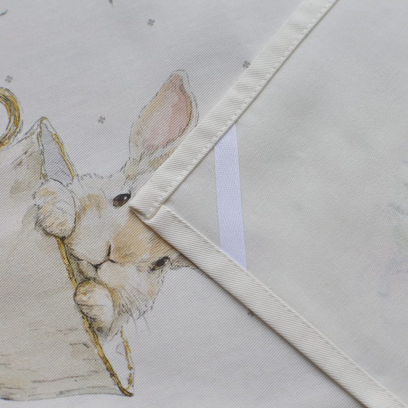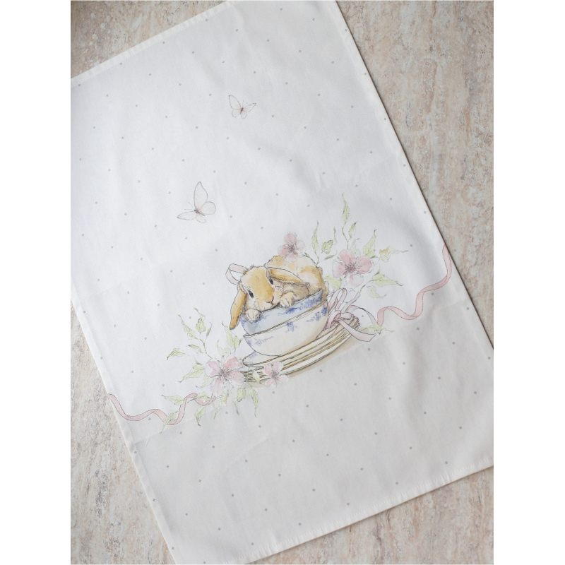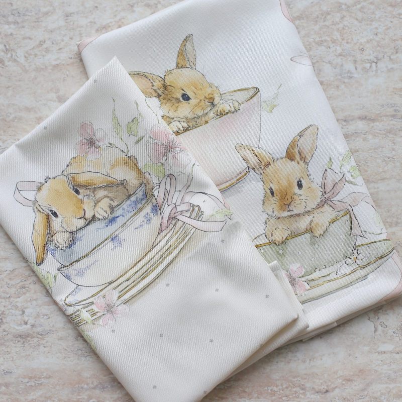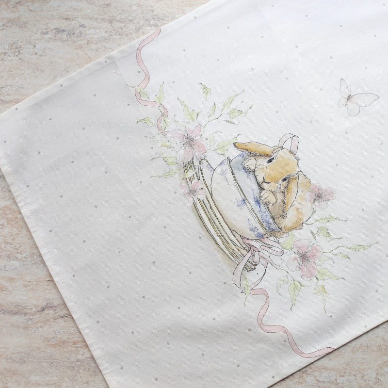 Милые кролики, уютно устроившийся среди фарфоровой посуде, напоминают о традициях Пасхи, когда дом наполняется светом, ароматом куличей и весёлым щебетом детей. Нежные цветы и порхающие бабочки обрамляют центральный мотив, создавая атмосферу настоящего пасхального чуда. Пусть этот текстиль принесёт в ваш дом частичку пасхальной радости!