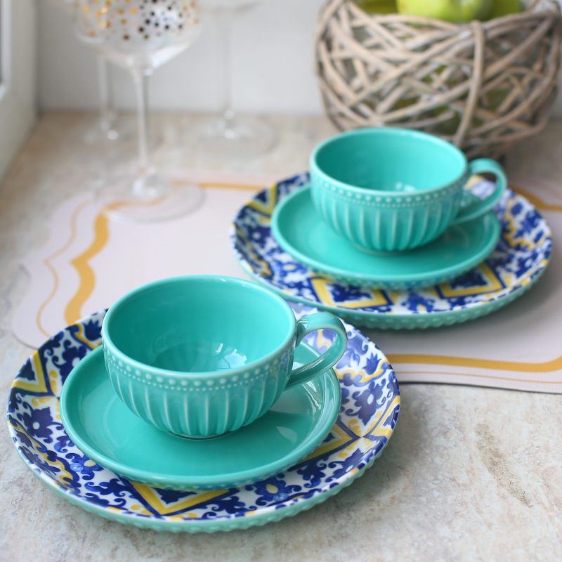 Набор чайных пар и тарелок "Beautiful patterns" — искусство чаепития в каждом мгновении. Откройте для себя новый уровень утончённости с набором для чаепития "Beautiful patterns" — идеальным сочетанием стиля, комфорта и премиального качества. В комплект входят 2 чайные пары в элегантном бирюзовом цвете и 2 изысканные тарелки с утончённым узором, выполненные из высококачественного фарфора с глянцевой поверхностью.