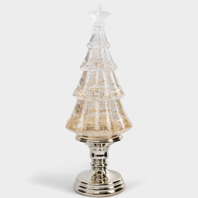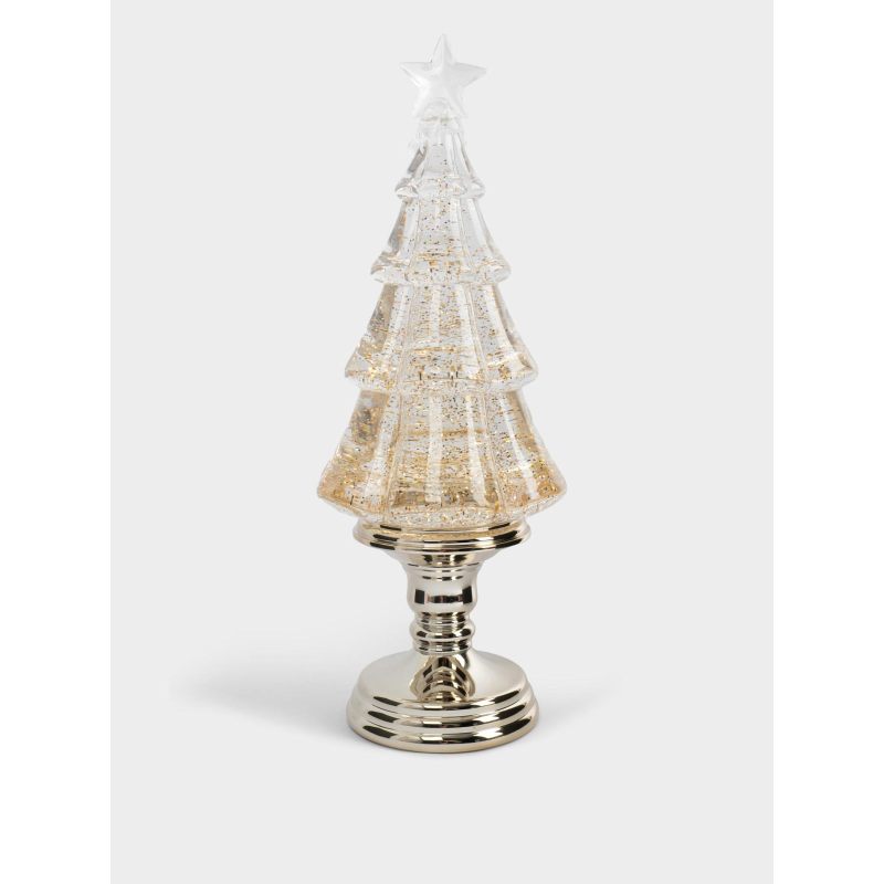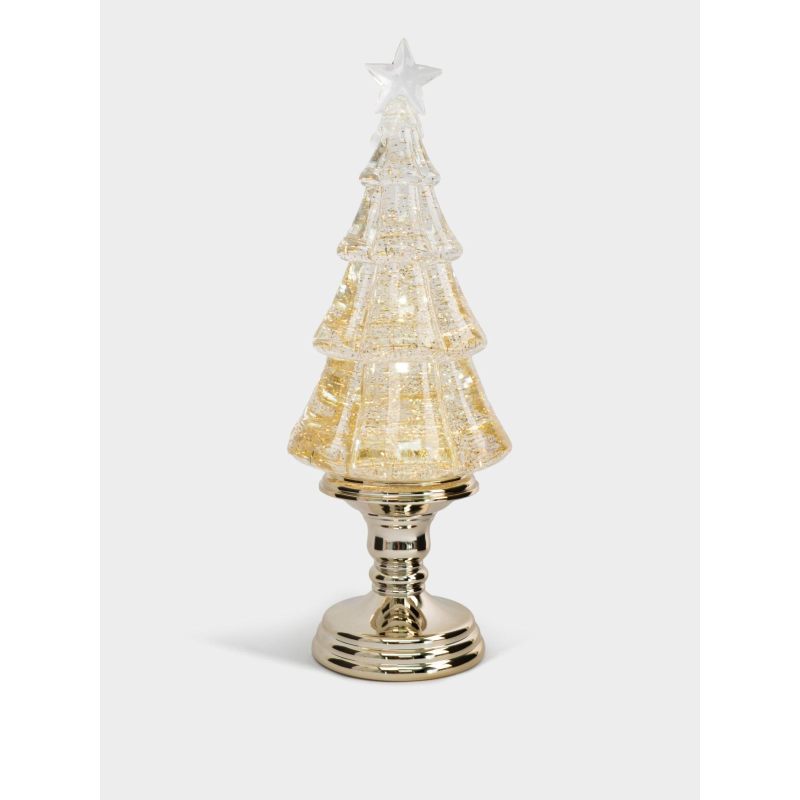 Дизайн: фонарь выполнен в форме классической ёлки с золотистыми блёстками внутри, создающими эффект снежного вихря. На вершине расположена рождественская звезда, добавляющая праздничного настроения.