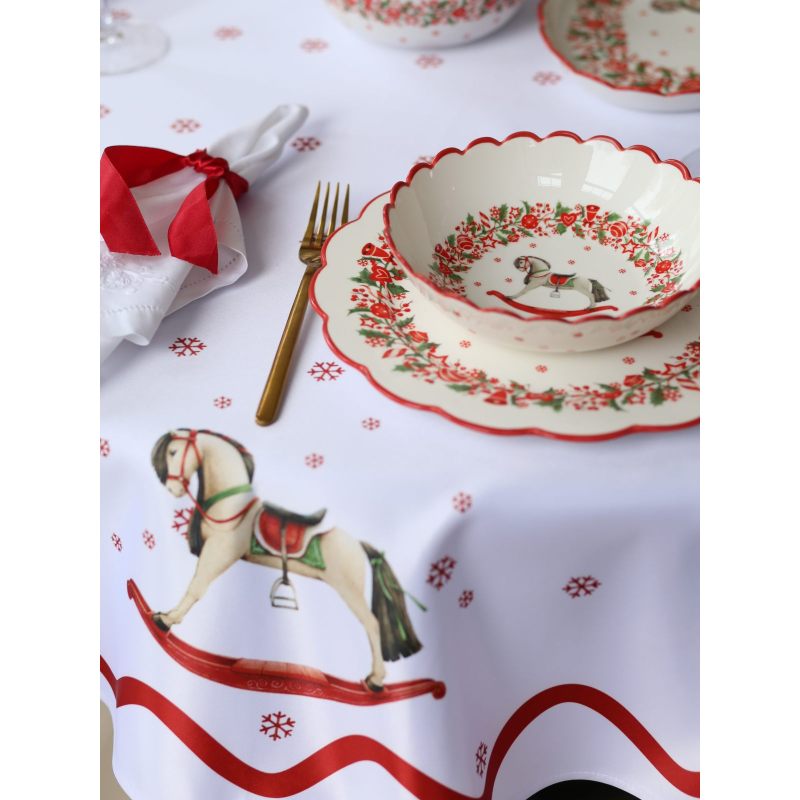 Роскошная новогодняя скатерть "Christmas Traditions" воплощение праздничного стиля. Символ удачи в новом 2026 году — Красная Огненная Лошадь — стал вдохновением для создания этой уникальной праздничной скатерти. Каждый элемент дизайна наполнен энергией предстоящего года.