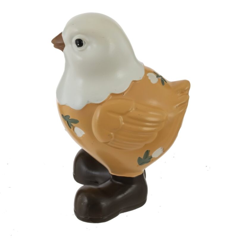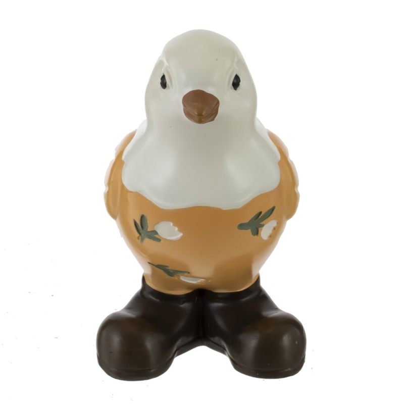 Пасхальная декоративная фигурка «Цыплёнок в сапогах» — очаровательный элемент весеннего декора, который мгновенно создаёт атмосферу уюта и радости. Милый цыплёнок с белой пушистой головкой и золотисто-коричневым тельцем, украшенным нежными цветочными узорами, выглядит невероятно живо и трогательно.