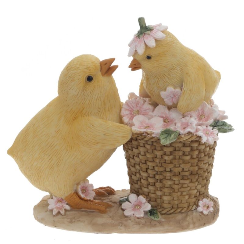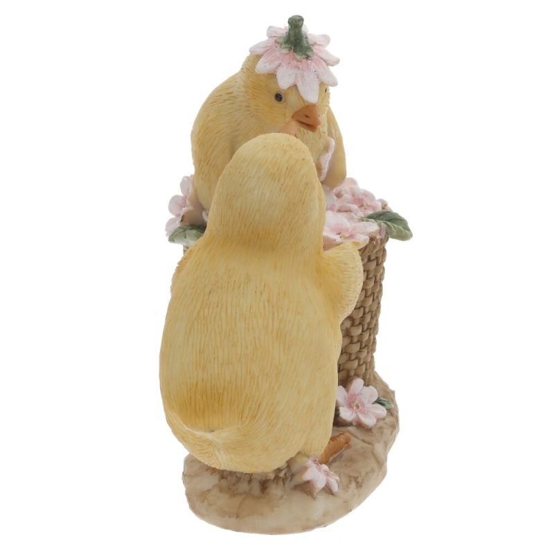 Пасхальная декоративная фигурка «Цыплята» — очаровательный элемент весеннего декора, воплощающий атмосферу тепла и радости. Композиция изображает двух пушистых жёлтых цыплят: один с любопытством заглядывает в плетёную корзинку, наполненную нежными розовыми цветами, а второй уютно устроился внутри, украсив головку цветочным венком.