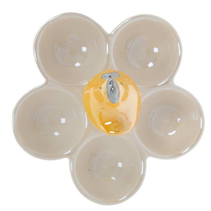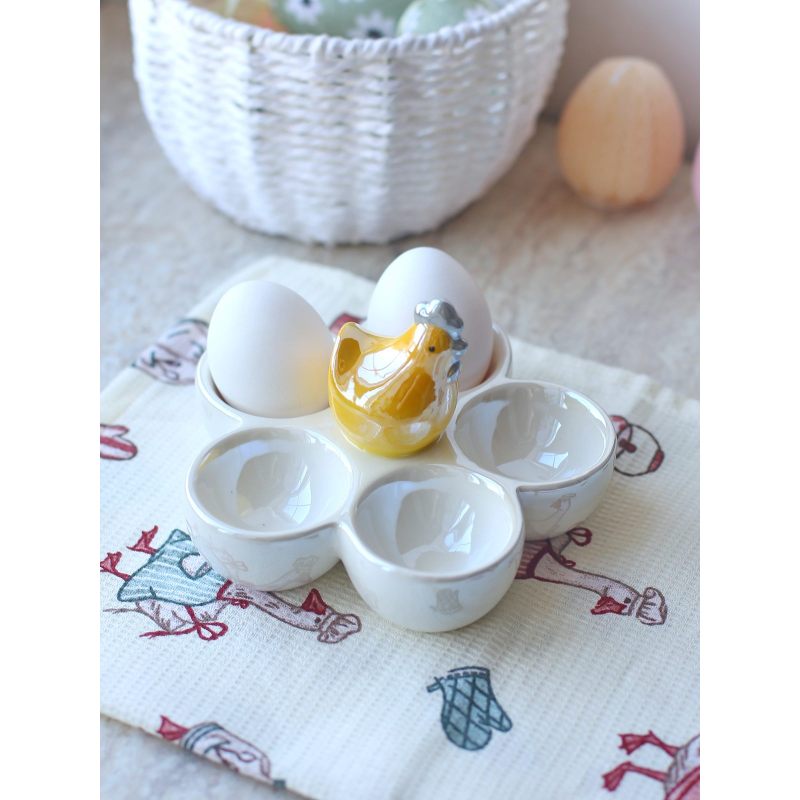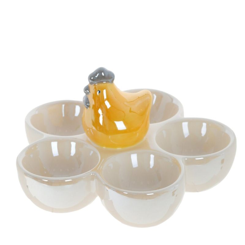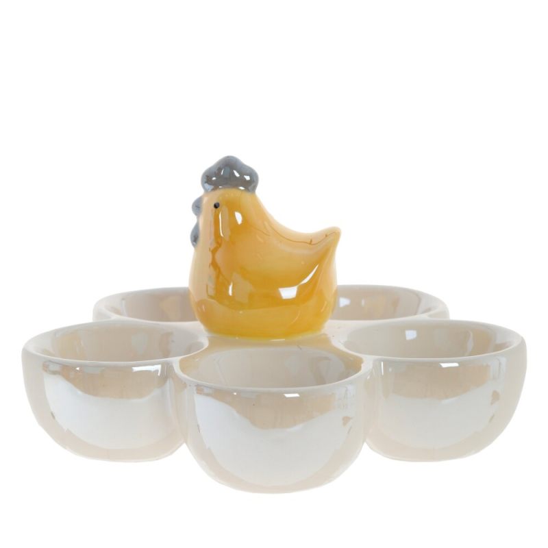 Изящная керамическая подставка в виде золотистой курочки — стильное решение для праздничной сервировки. Центральный элемент — фигурка курочки с серым гребешком, окружённая пятью вместительными углублениями для пасхальных яиц.