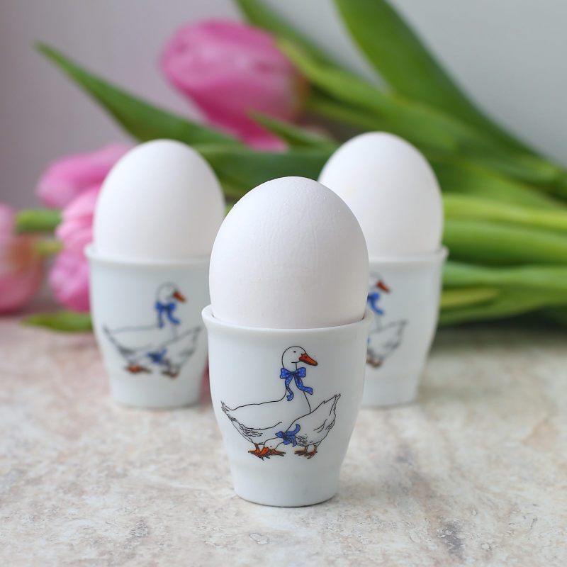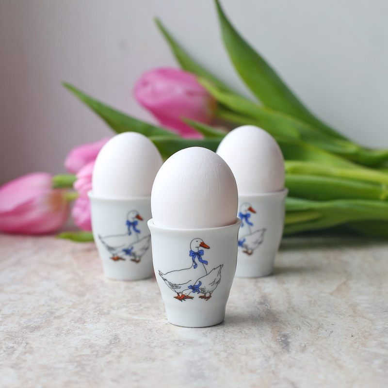 Добавьте нотку классического шарма на свой стол с элегантной фарфоровой подставкой для яйца, украшенной милым изображением гусей с синими бантами.