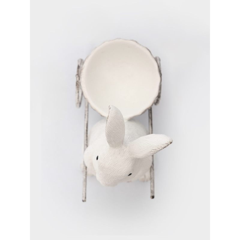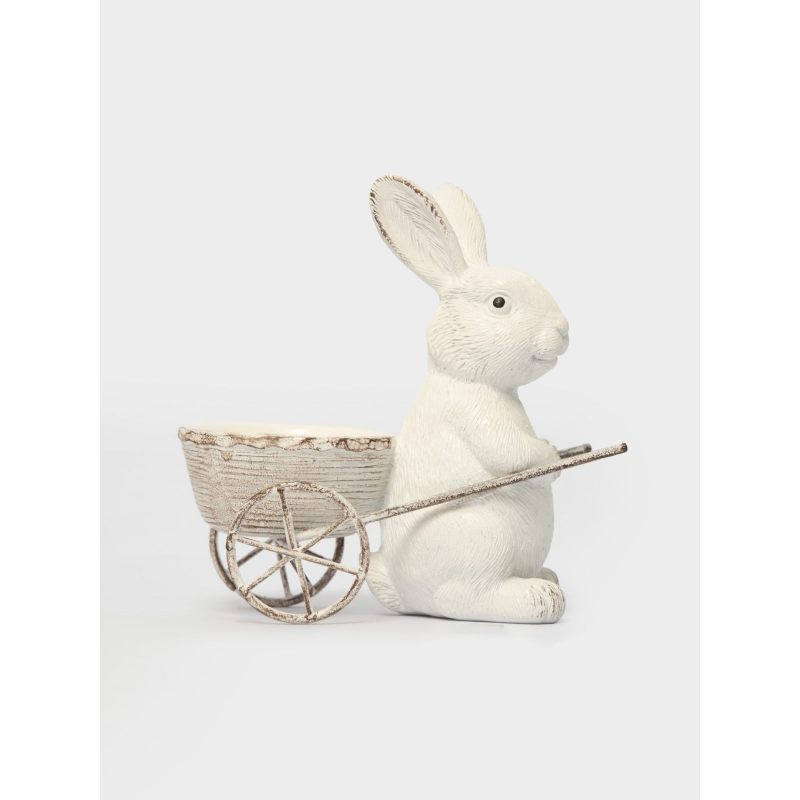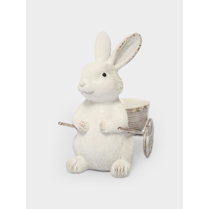 Эта изящная подставка воплощает в себе всю прелесть пробуждающейся природы и радостное настроение Пасхи. Белоснежный кролик с выразительными ушками, словно только что выбежавший из весеннего леса, бережно держит миниатюрную тележку. Его поза полна лёгкости и игривости, а слегка потёртая текстура придаёт изделию особый шарм винтажного уюта.