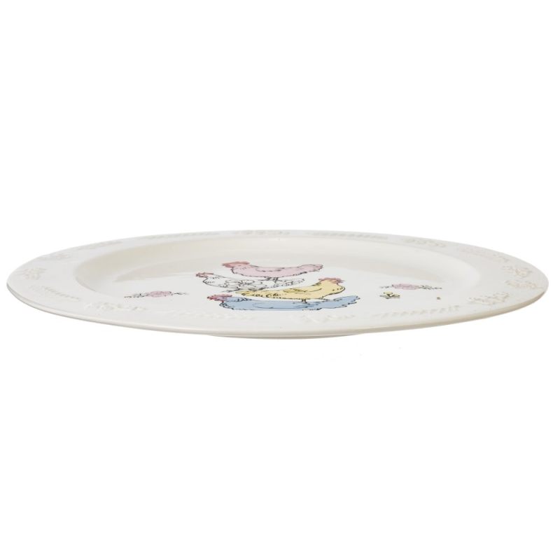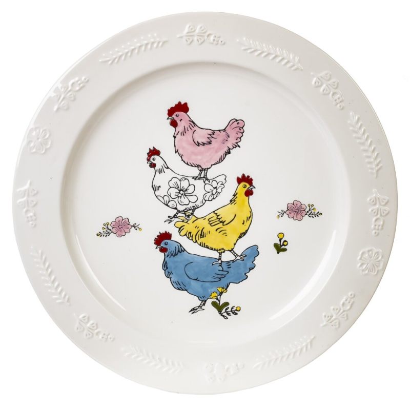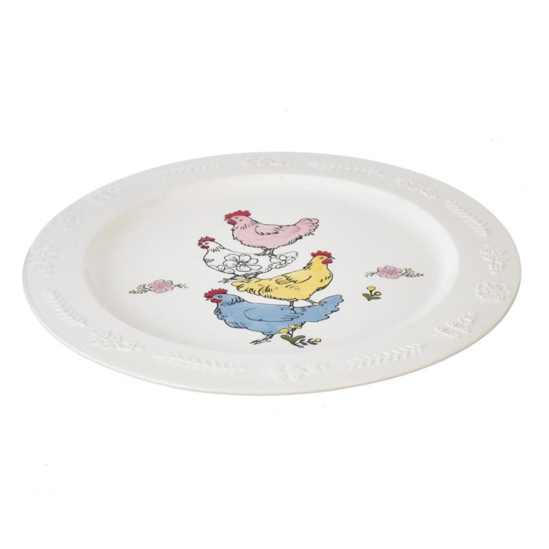 На белой глянцевой поверхности изображены четыре забавные курочки в розовом, белом, жёлтом и голубом цветах, окружённые нежными весенними цветами. По краю тарелки выполнен рельефный орнамент с листьями и цветами, который придаёт изделию особый шарм и завершённый вид.
