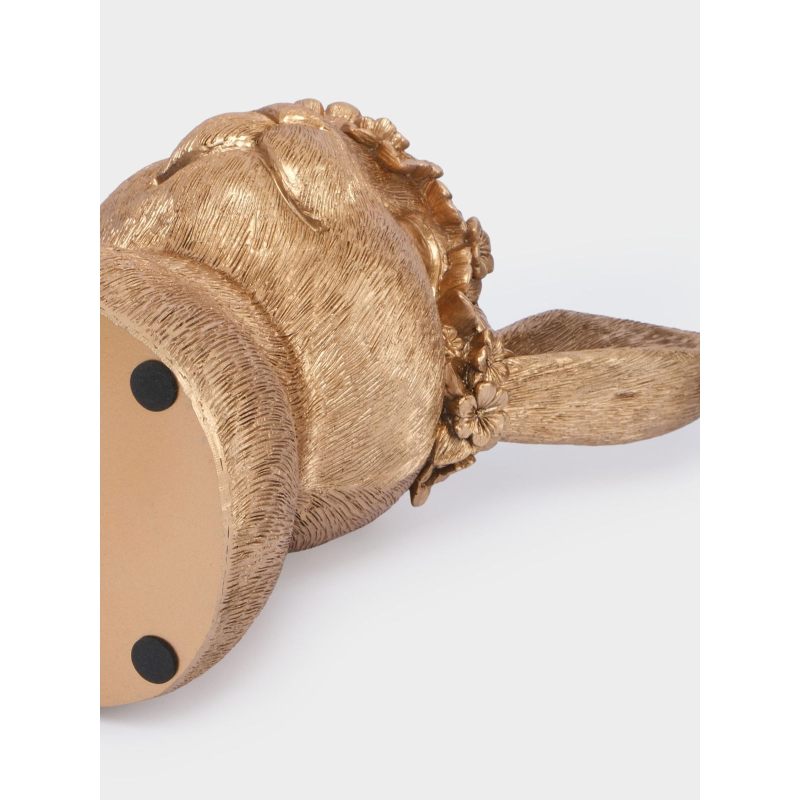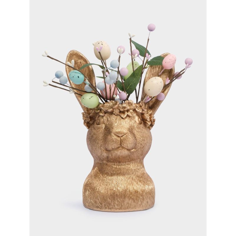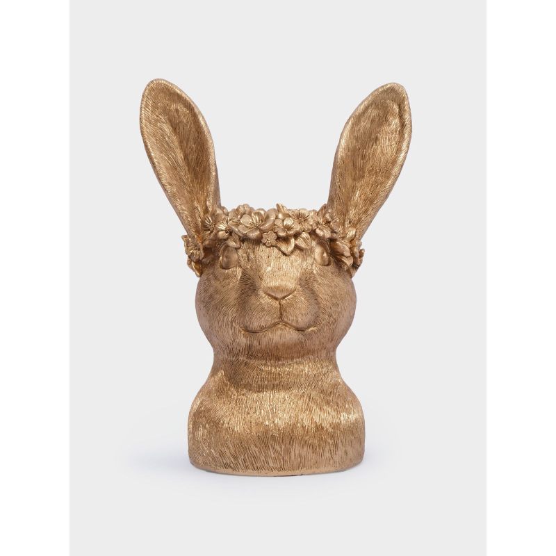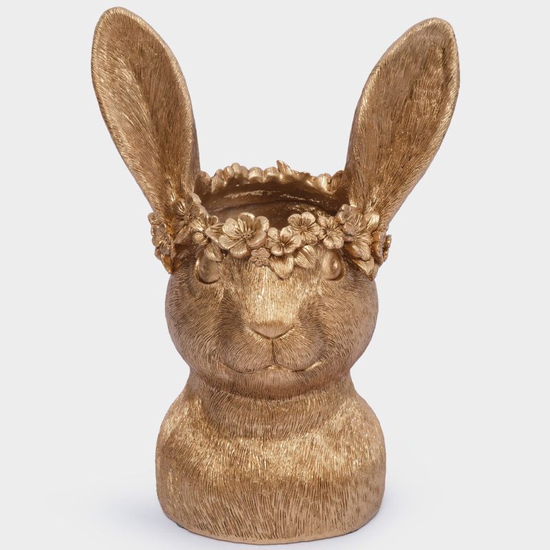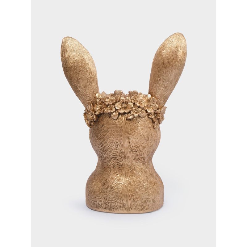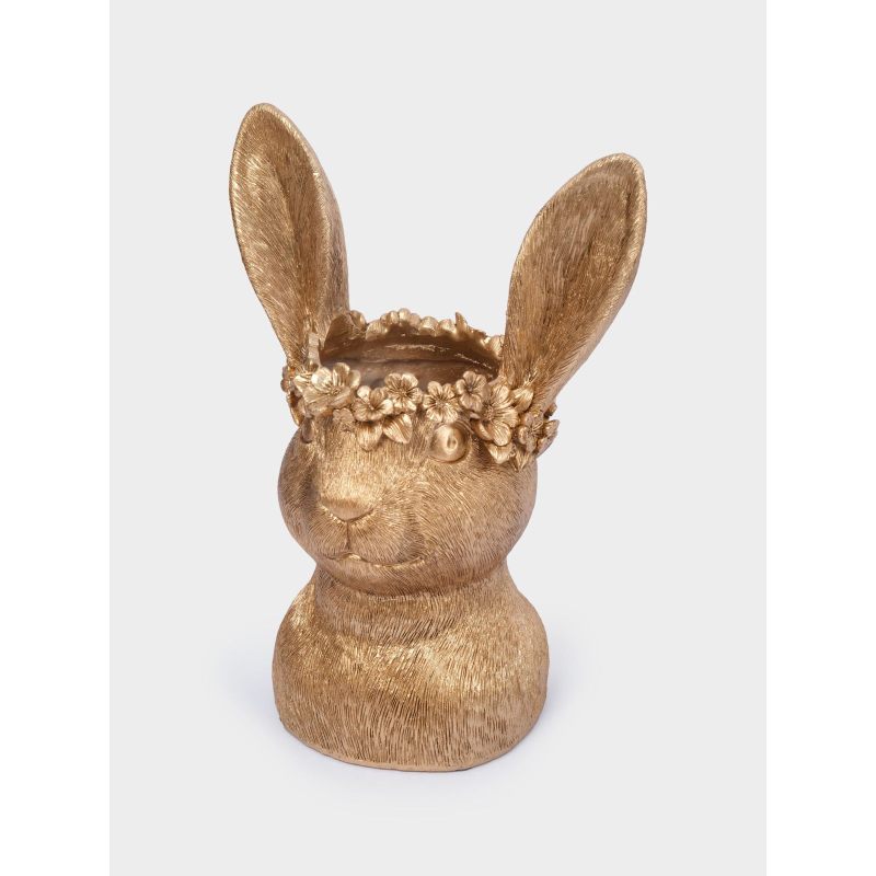 Эта изысканная ваза в виде головы золотистого кролика, украшенной нежным цветочным венком, словно пришла к нам из сказки о пробуждающейся природе. Благородная позолота придаёт изделию особую роскошь, а детализированная текстура меха и изящные ушки создают ощущение живой, трогательной фигурки. Цветочные мотивы в венке напоминают о первых весенних бутонах — символах обновления и надежды.