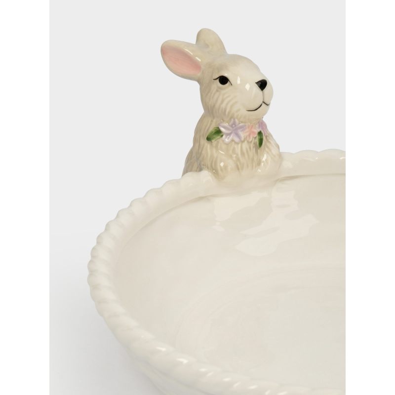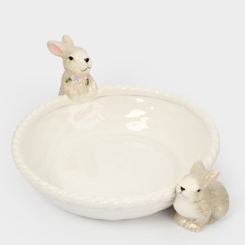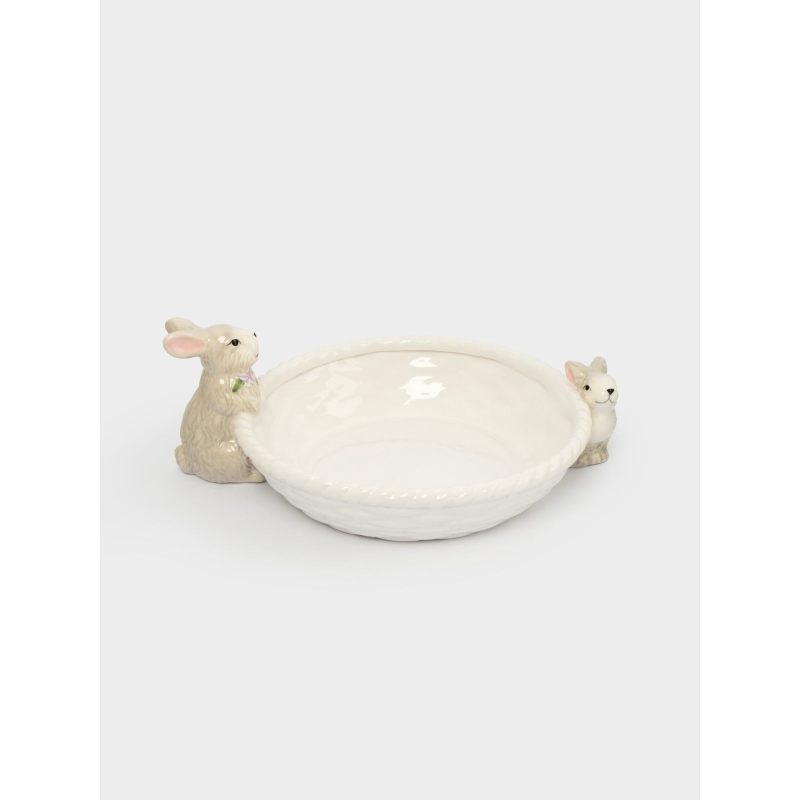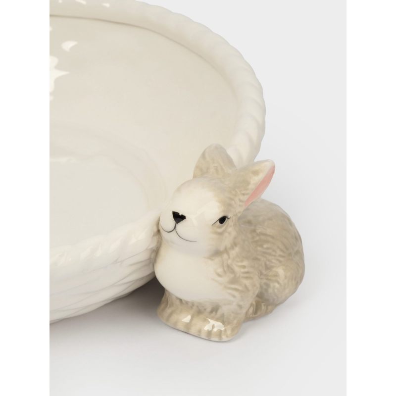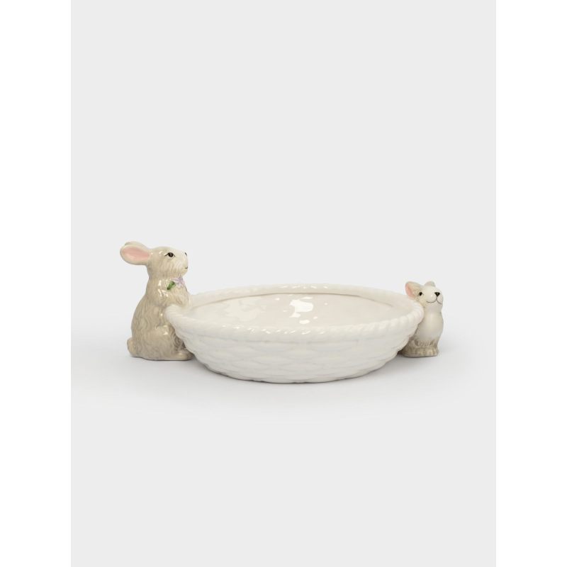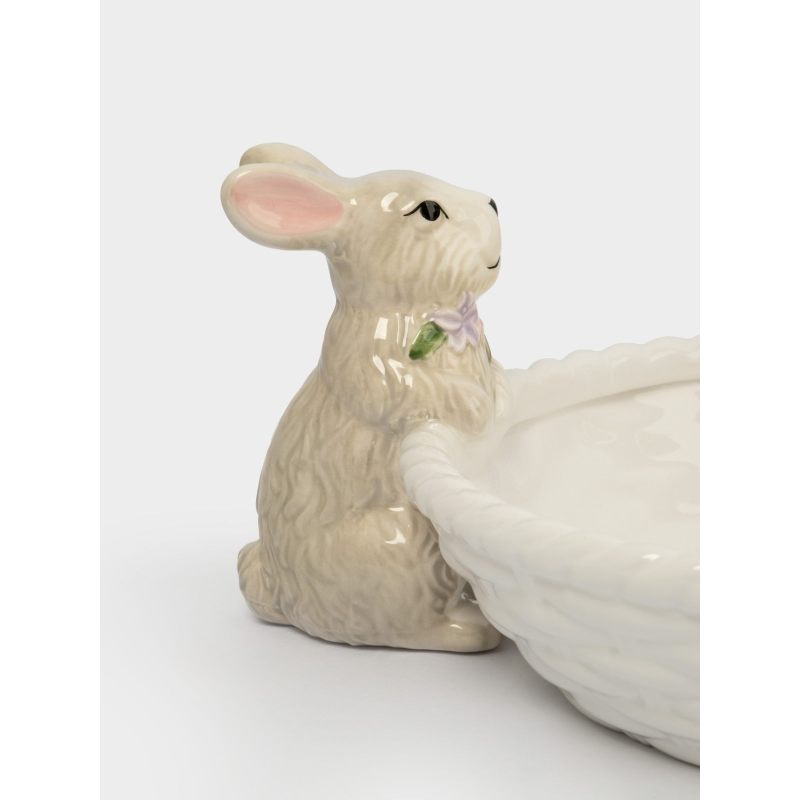 Чистая белая глазурь вазы гармонично сочетается с мягкими пастельными оттенками кроликов, создавая ощущение лёгкости и свежести — как первый весенний ветерок. Форма корзинки практична: здесь с комфортом разместятся сочные яблоки, яркие мандарины, нежные персики или пасхальные сладости.