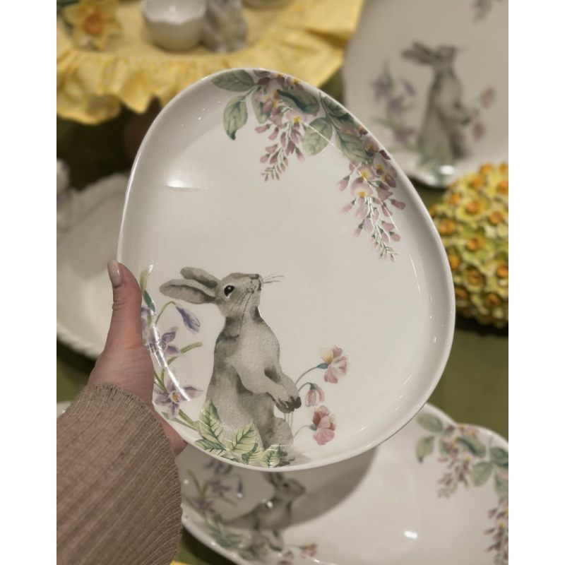 Изящная форма блюда, напоминающая пасхальное яйцо, сразу задаёт торжественный настрой. Нежная акварельная роспись с изображением милого кролика, окружённого цветущими веточками и первоцветами, переносит в атмосферу пробуждающейся природы. Мягкие пастельные оттенки — розовые, зелёные, кремовые — создают ощущение лёгкости и свежести, словно утренний весенний ветерок ворвался в дом.