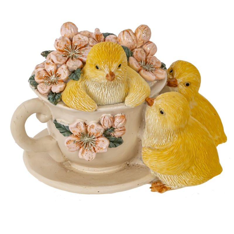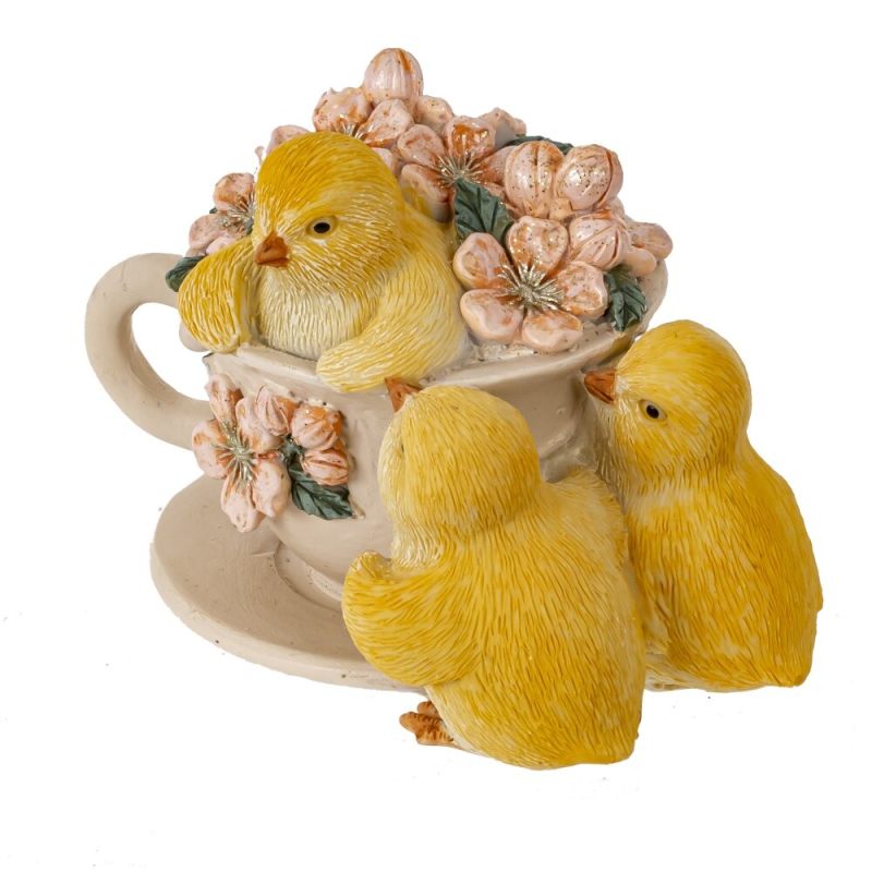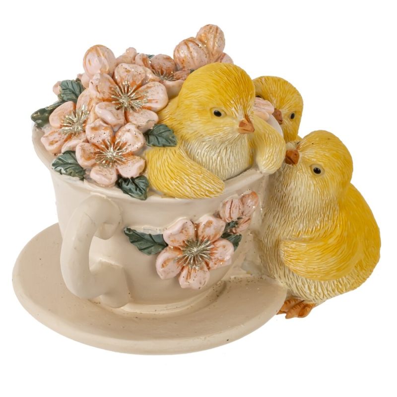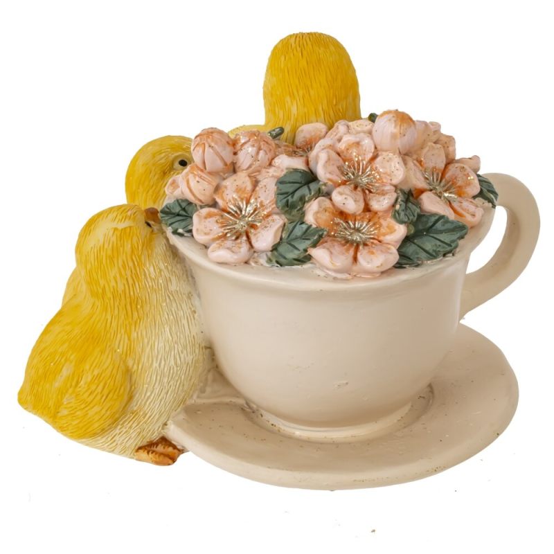 Главные герои: три пушистых цыплёнка насыщенного жёлтого цвета. Один уютно устроился внутри чашки среди цветочной композиции, двое других расположились рядом, будто заглядывают внутрь в поисках приключений.