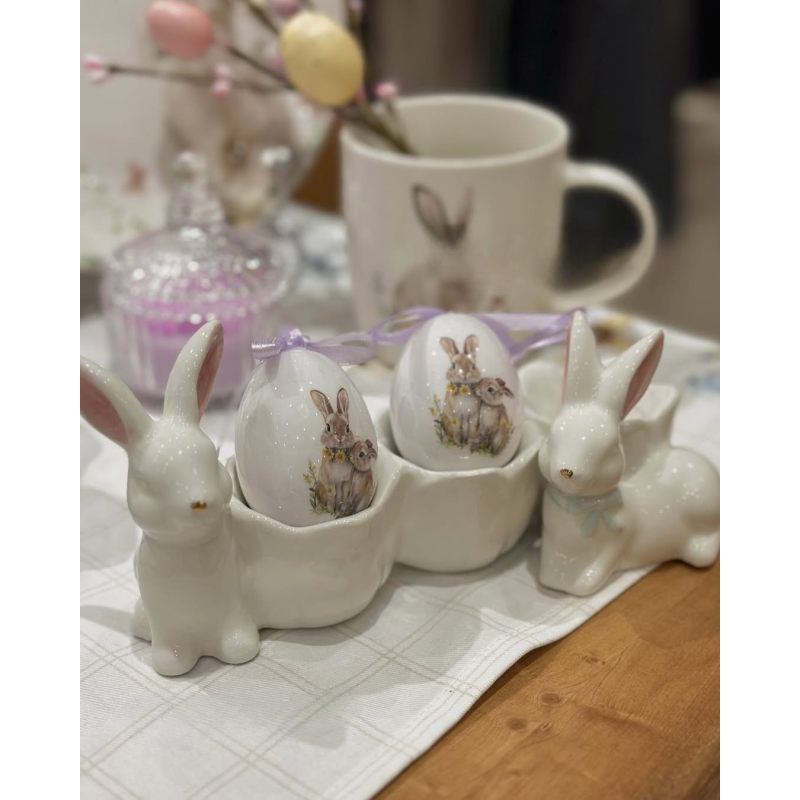 Эта изящная керамическая подставка воплощает в себе всю нежность и радость светлого праздника. Два милых кролика, словно только что выбежавших на солнечную полянку, бережно «охраняют» три отделения для пасхальных яиц. Один из кроликов украшен нежным бантиком, а рядом с ним — утончённый цветочный акцент, символизирующий пробуждение природы.