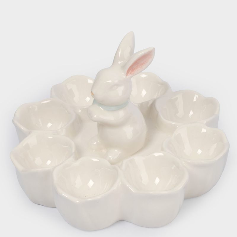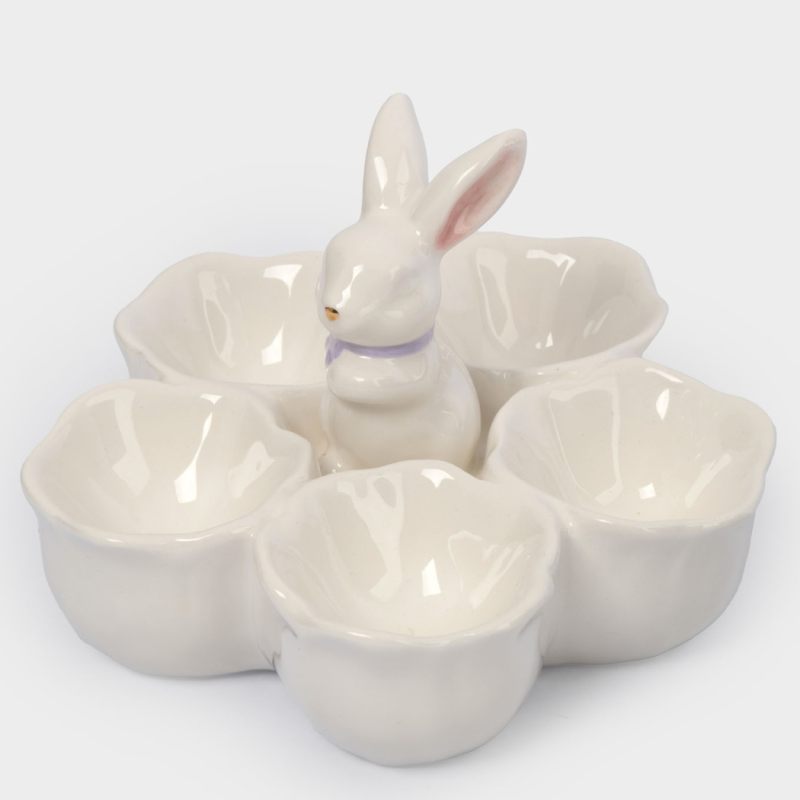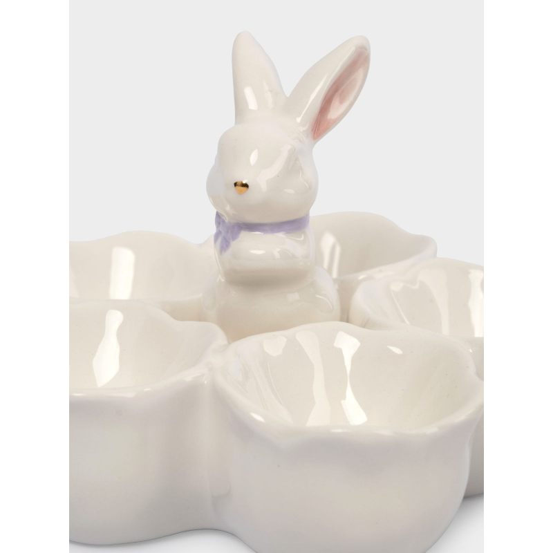 Эта изысканная керамическая подставка воплощает в себе всю нежность и радость светлого праздника. В центре композиции — милый кролик с изящным фиолетовым бантиком, словно только что выбежавший на солнечную полянку. Вокруг него расположены пять аккуратных «лепестков»-отделений для пасхальных яиц, напоминающих цветущий цветок. Белоснежная глазурь и плавные линии создают ощущение лёгкости и чистоты, а детализированный дизайн вызывает искреннее умиление.