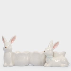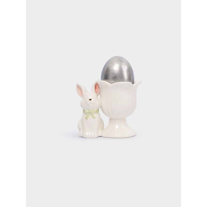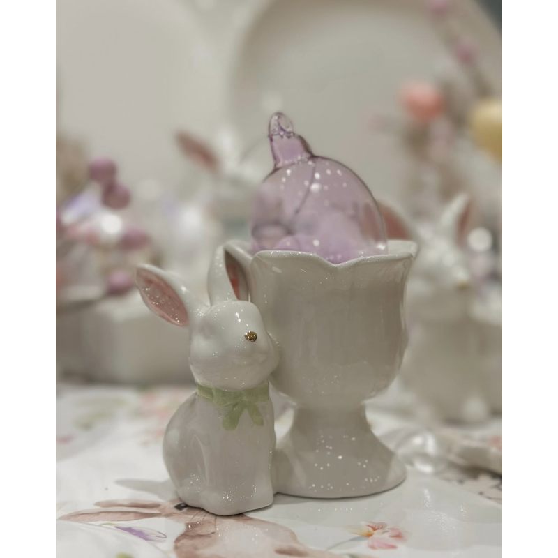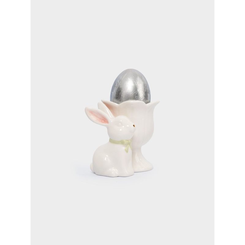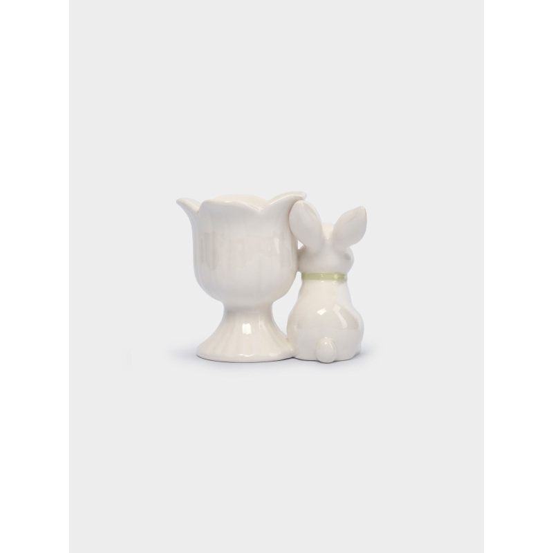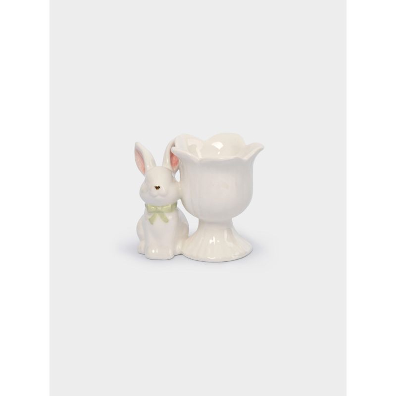 Этот изящный предмет словно сошёл со страниц детской сказки: белоснежный кролик с нежным бантиком аккуратно «обнимает» фарфоровую чашечку для яйца. Его трогательный взгляд и пушистые ушки вызывают умиление, а лаконичный дизайн подчёркивает утончённость изделия. Лёгкий цветочный акцент в оформлении добавляет композиции свежести и гармонии, напоминая о пробуждении природы в дни Пасхи.