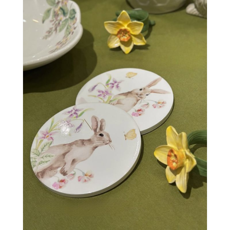 Изящный дизайн подставки сразу погружает в атмосферу светлого праздника: белоснежная керамическая поверхность украшена милым изображением кролика, окружённого нежным цветочным венком. Этот символичный мотив воплощает пробуждение природы и обновление — ключевые идеи Пасхи. Кажется, будто лесной гость только что выбрался на солнечную полянку, чтобы поприветствовать наступление весны.