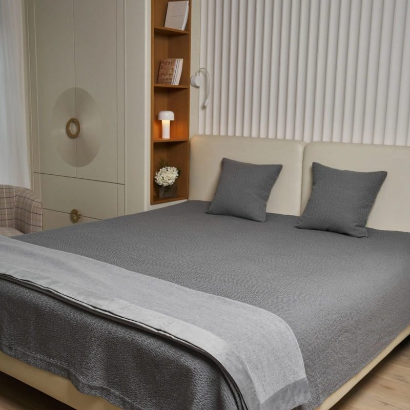 Покрывало ЛУННАЯ ЖЕМЧУЖИНА самодостаточно и не требует сложных комбинаций. Дополните его подушками из этой же коллекции и может быть однотонной подушкой вытянутой формы глубокого изумрудного оттенка. Изнаночная сторона — это отдельный повод для восхищения! Мягкая, хлопковая тканная оборотная сторона покрывала не даст скользить покрывалу на матрасе, что гарантирует порядок в спальне, даже если вы любите днем полежать на кровати и почитать книгу или поиграть с детьми.