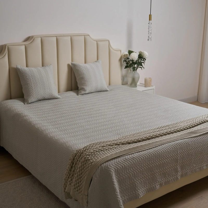 Покрывало "ЗИГГИ"— предмет интерьера которое переосмысливает роскошь. Дизайн состоит из объемных зигзагов, создающих классный 3D-эффект, благодаря которому покрывало красиво и не плоско лежит на кровати добавляя спальне элегантности.