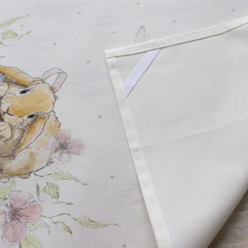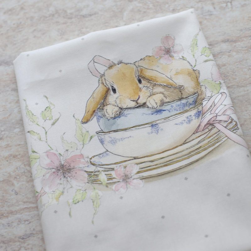 Милый кролик, уютно устроившийся среди фарфоровых тарелок, напоминает о традициях Пасхи, когда дом наполняется светом, ароматом куличей и весёлым щебетом детей. Нежные цветы и порхающие бабочки обрамляют центральный мотив, создавая атмосферу настоящего пасхального чуда. Пусть этот текстиль принесёт в ваш дом частичку пасхальной радости!