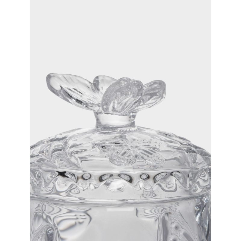Изящная сахарница из прозрачного стекла с рельефным узором в виде бабочек — воплощение утончённого стиля на вашей кухне. Крышка украшена фигурной ручкой в форме бабочки, что придаёт изделию особый шарм. Идеальный аксессуар для сервировки чая или кофе.