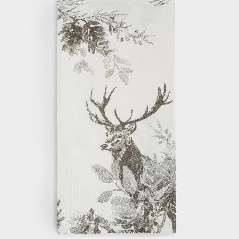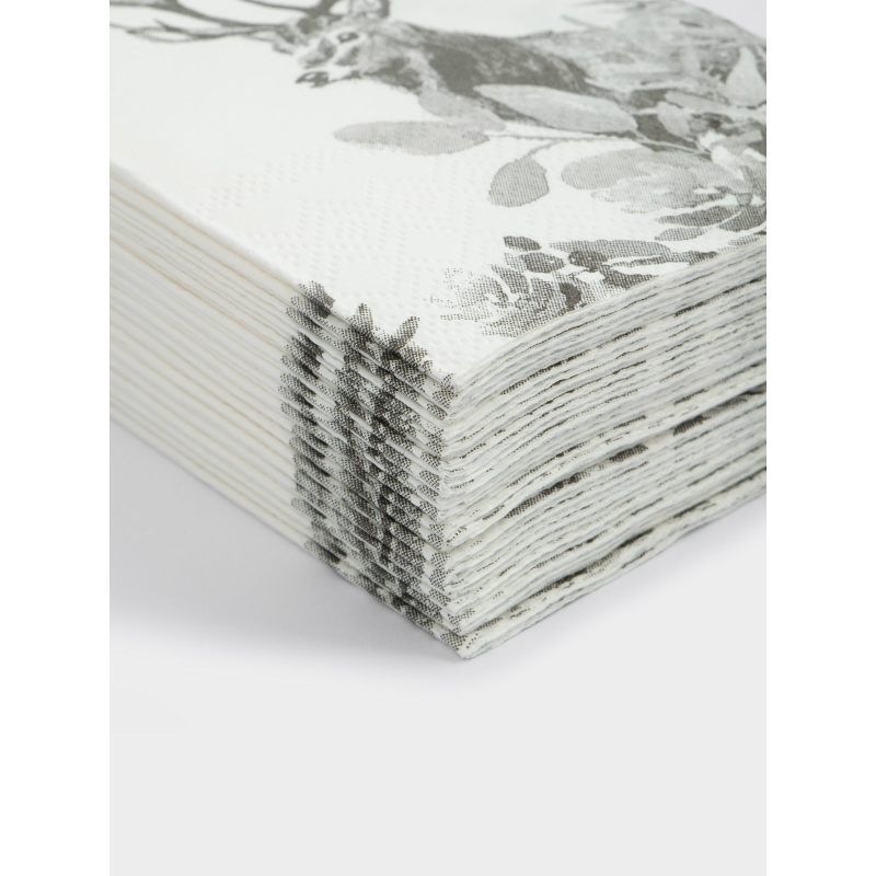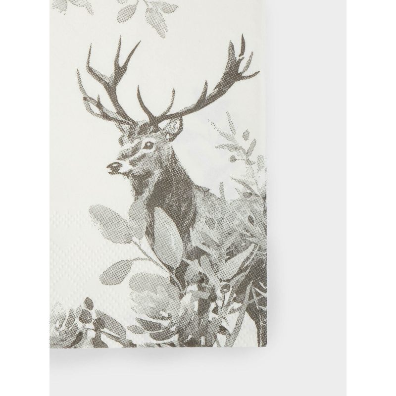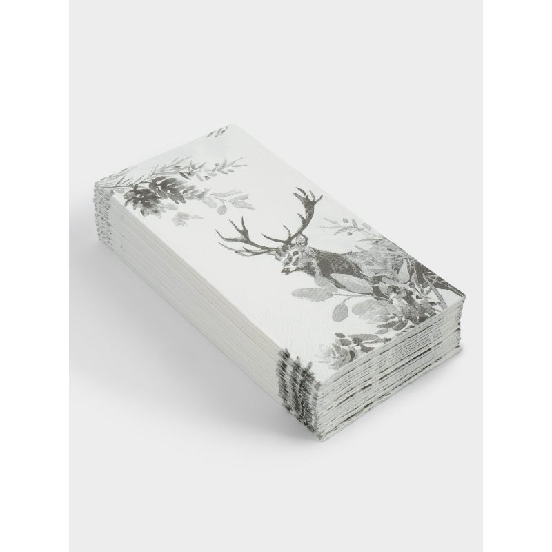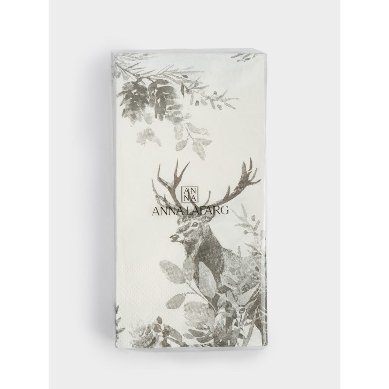 Изысканные бумажные салфетки с благородным изображением оленя — идеальное дополнение к праздничному столу. Белоснежный фон и утончённый серый рисунок создают атмосферу зимней сказки.