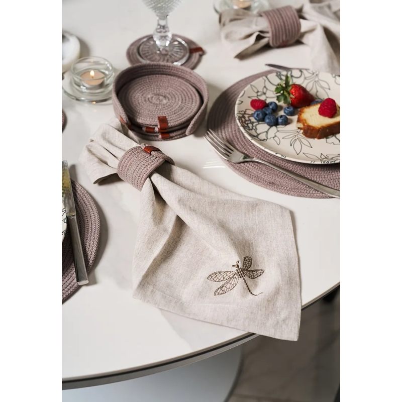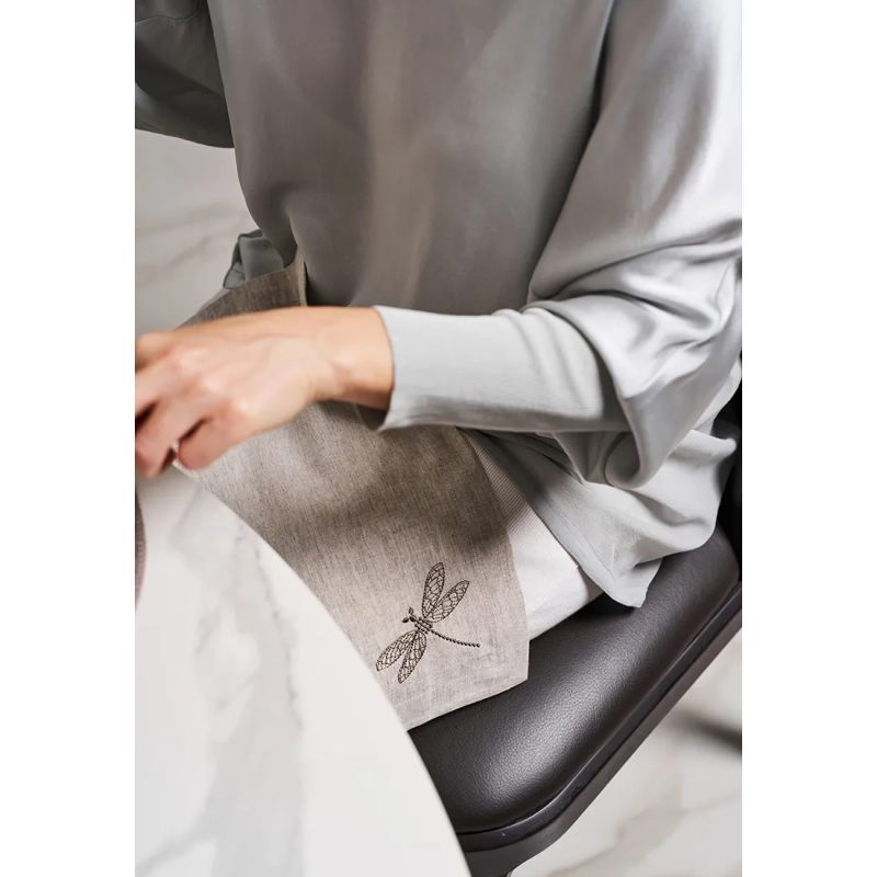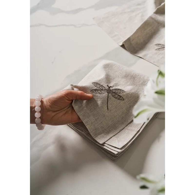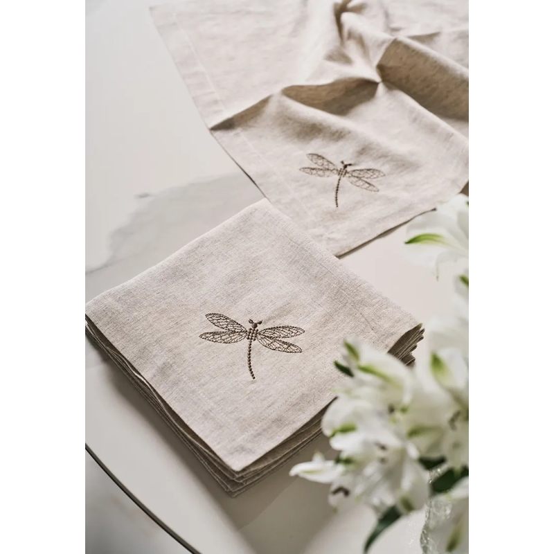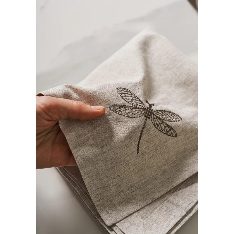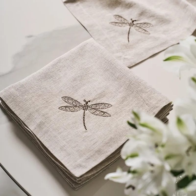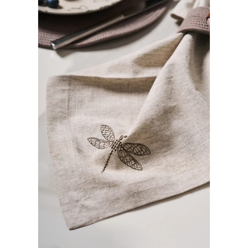 Салфетка с вышивкой "Вечерние стрекозы", как тихий акцент, который делает ваш стол элегантнее. Столовая салфетка "Вечерние стрекозы" сшита изо льна с нежной вышивкой: парящей стрекозки. Край салфетки аккуратно обработан в классический уголок.