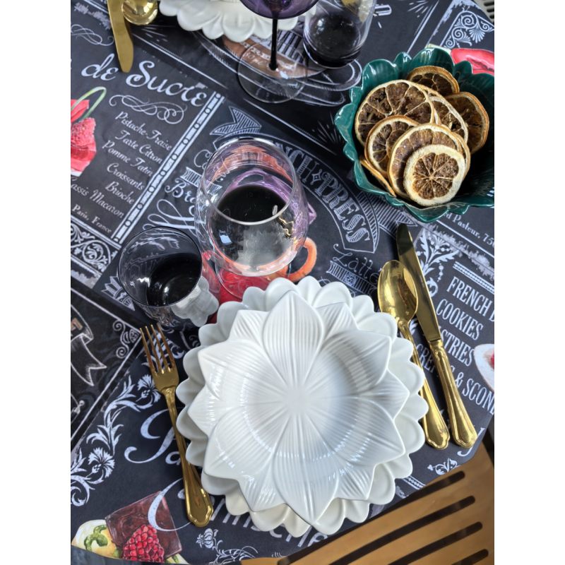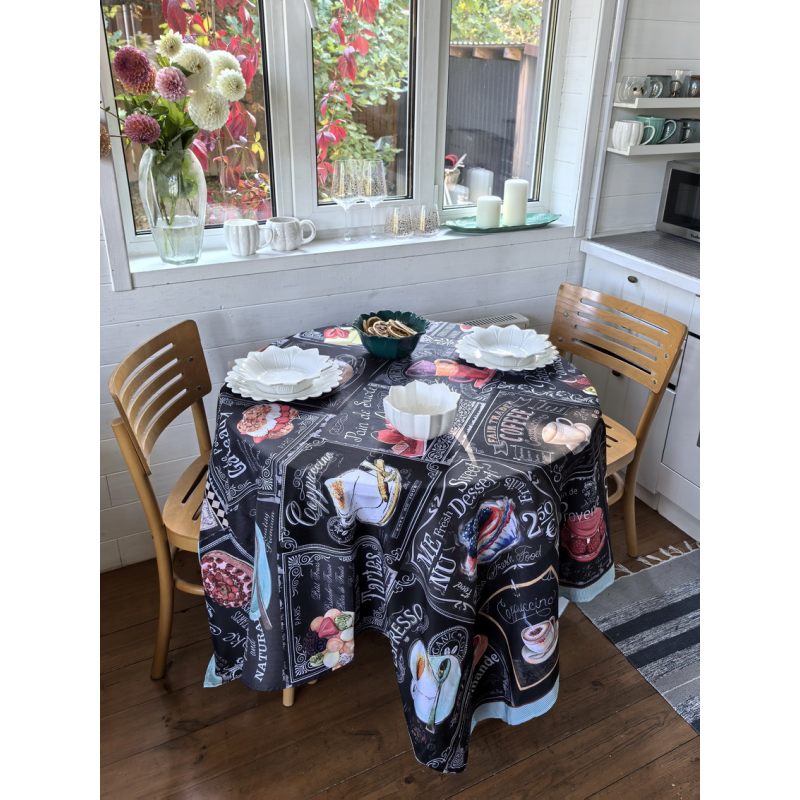Красивая скатерть с эффектным рисунком преобразит Вашу квартиру и станет оригинальным предметом интерьера! Цветовая гамма, выдержанная в черно-белых тонах, и небольшие яркие цветовые пятна с изображением разнообразных десертов выглядят необычно и сразу привлекают внимание. Ткань, из которой изготовлена скатерть, качественная, практически не мнется, легко стирается, быстро сохнет и надолго сохраняет первоначальный внешний вид. Мы заботимся о красоте и уюте Вашего дома и предлагаем купить дизайнерскую скатерть в нашем уютном интернет-магазине! Можно заказать скатерть по индивидуальным размерам, а также дополнить интерьер другими предметами из ассортимента нашего магазина.