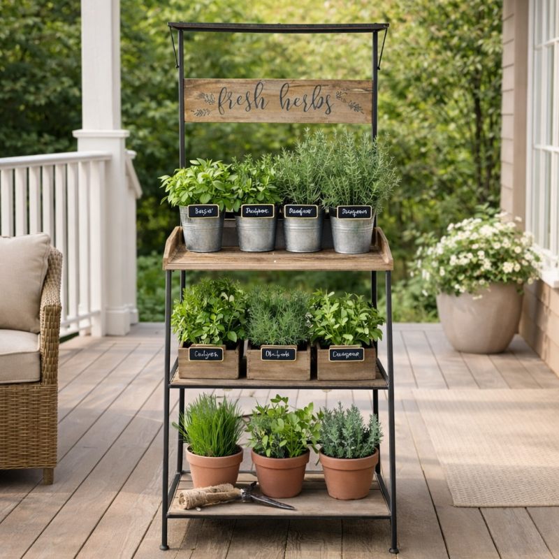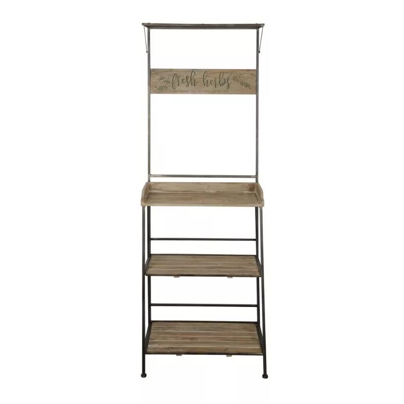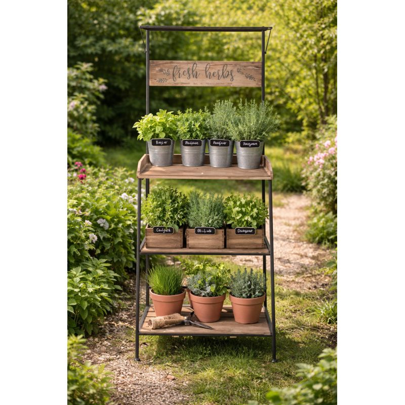 Элегантный стеллаж с тремя вместительными полками и декоративной панелью с надписью "Fresh herbs" станет изюминкой вашего интерьера. Сочетает в себе прочность металлического каркаса и тёплую текстуру состаренного дерева — идеальный баланс для стилей рустик, кантри, прованс, фармхаус или классики.
