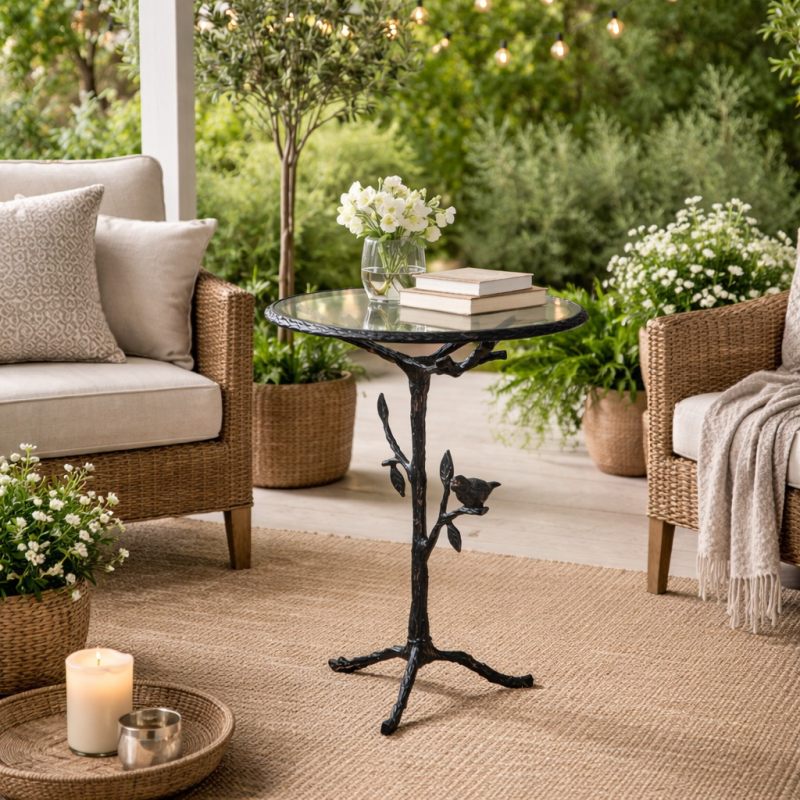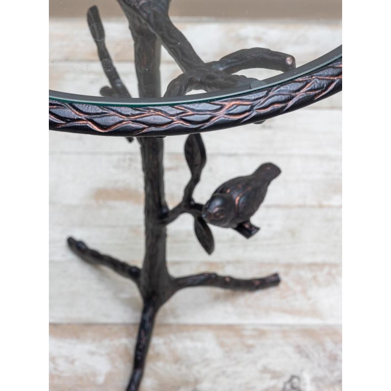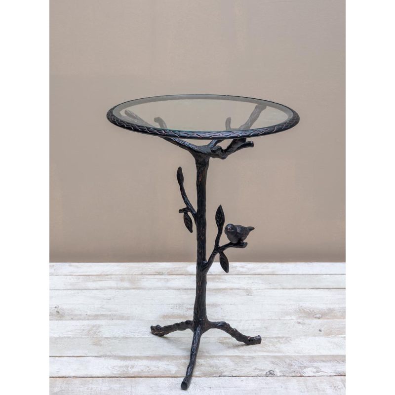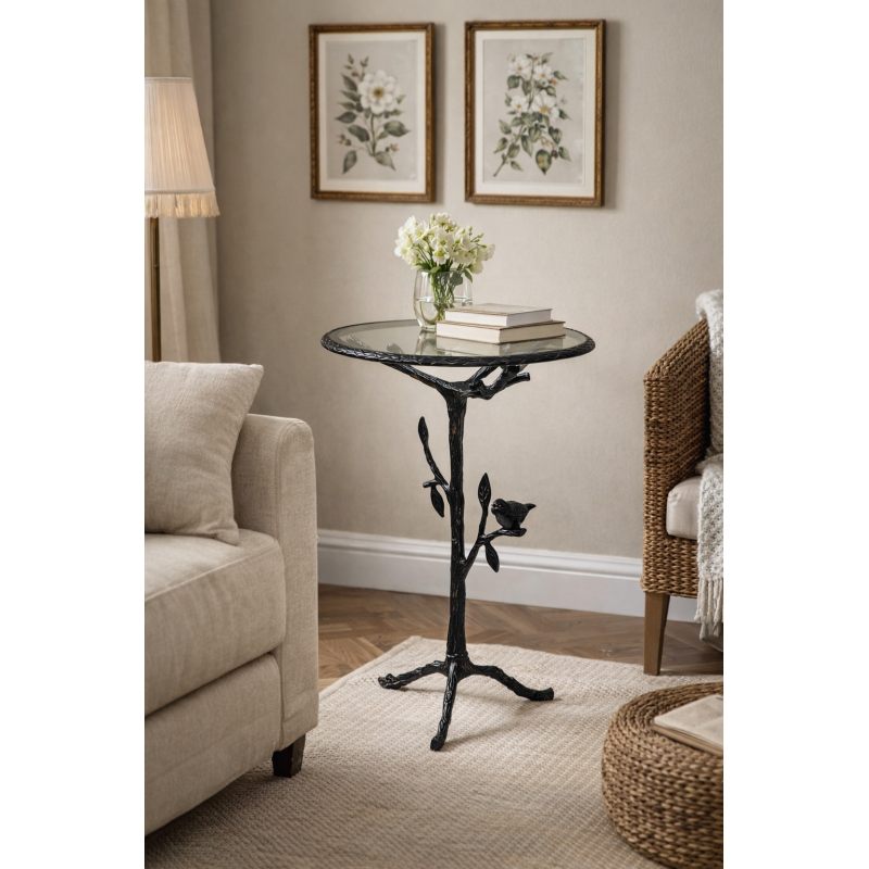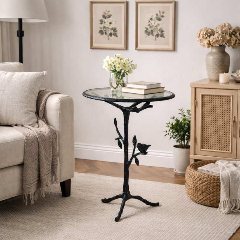 Элегантный декоративный столик, который превратит любой интерьер в произведение искусства. Выполнен в оригинальном дизайне, имитирующем ветку дерева с листьями и фигуркой птицы — идеальный акцент для гостиной, спальни или зоны отдыха.