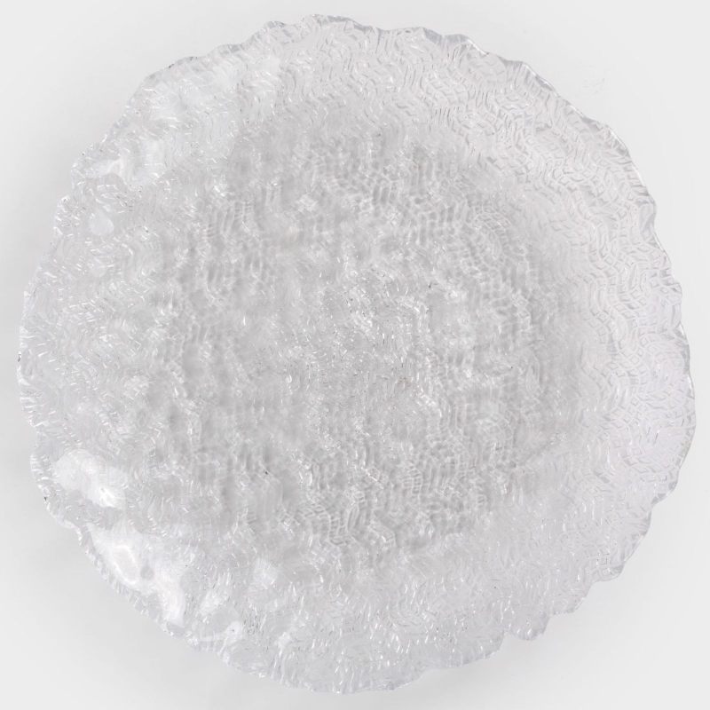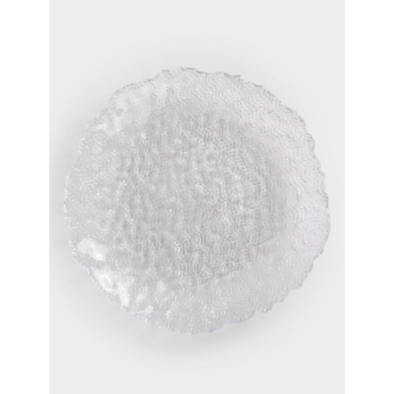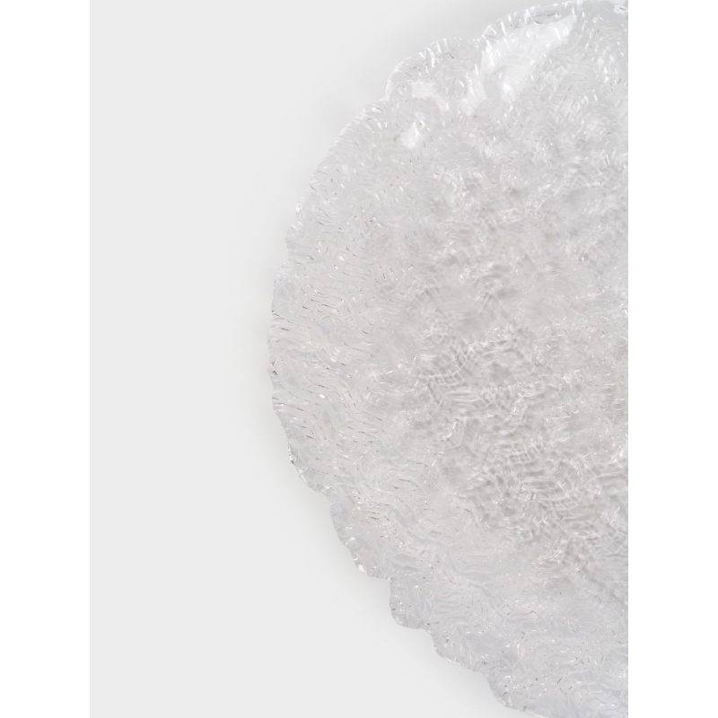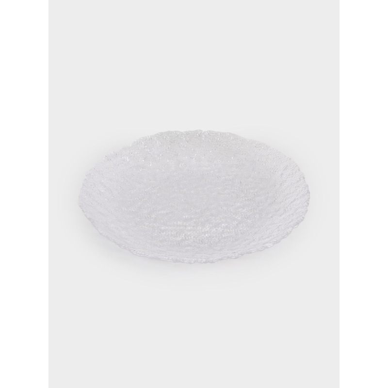 Эта тарелка словно запечатлела на стекле нежные волны утреннего озера, когда первые лучи солнца играют на поверхности воды. Рельефный узор создаёт неповторимую «рябь», преломляя свет и наполняя сервировку особым шармом.