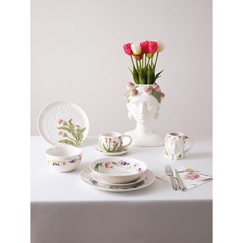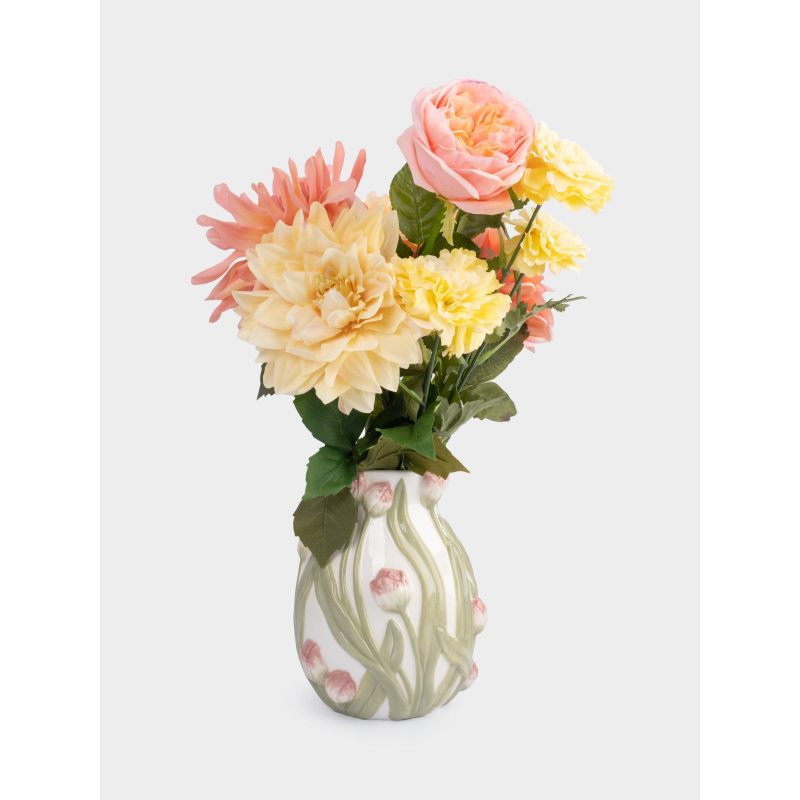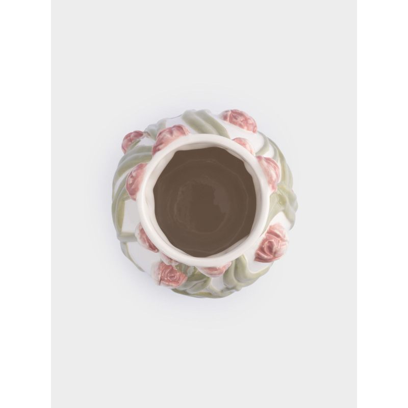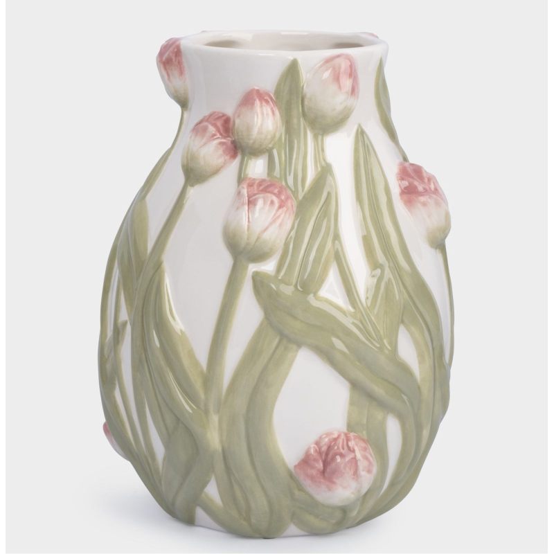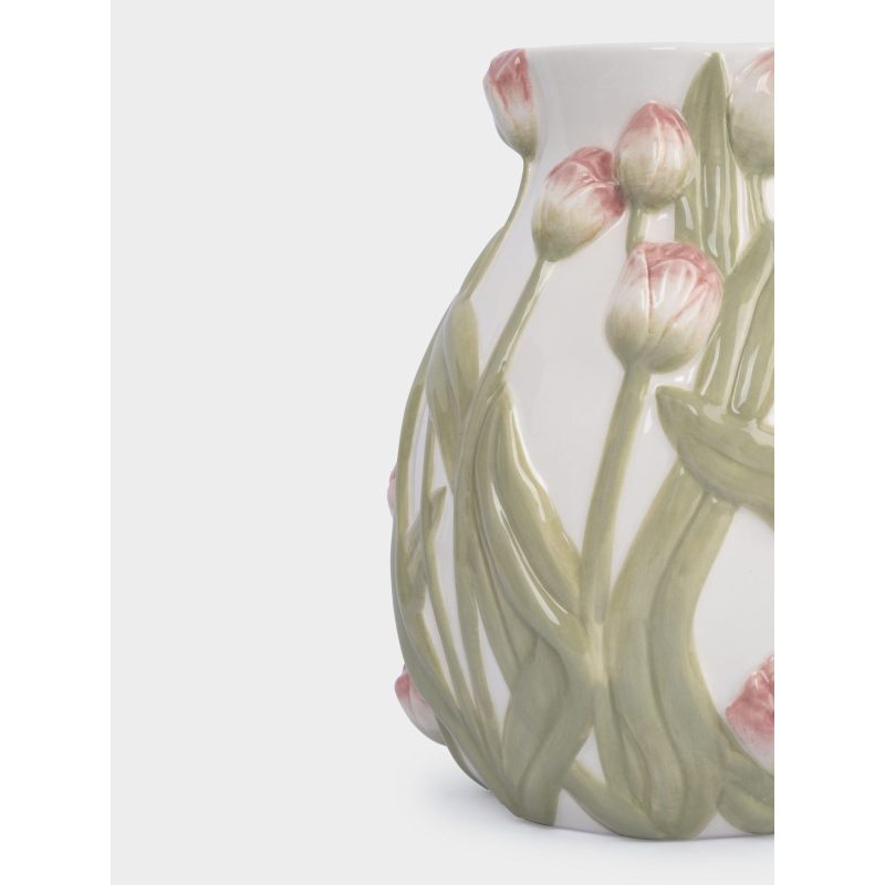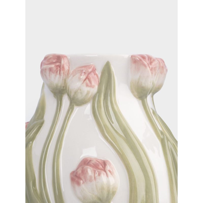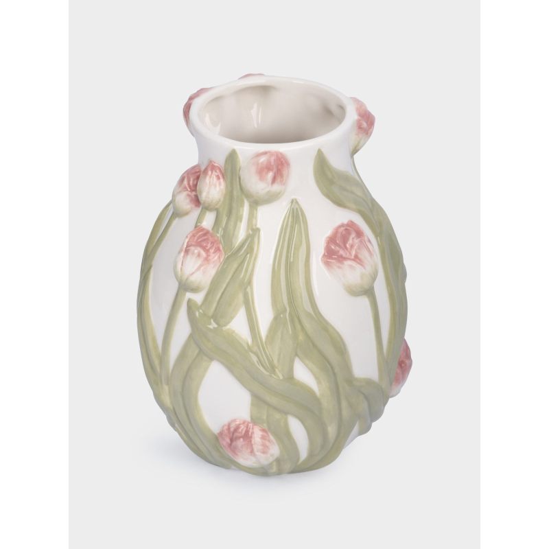 Нежная керамическая ваза, украшенная объёмным рельефом розовых тюльпанов и сочных зелёных листьев, воплощает саму суть весны. Её изысканный дизайн наполнит дом атмосферой пробуждения природы, лёгкости и радости.