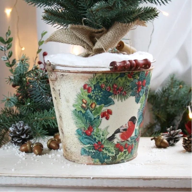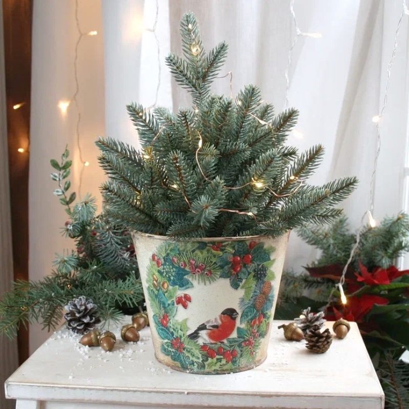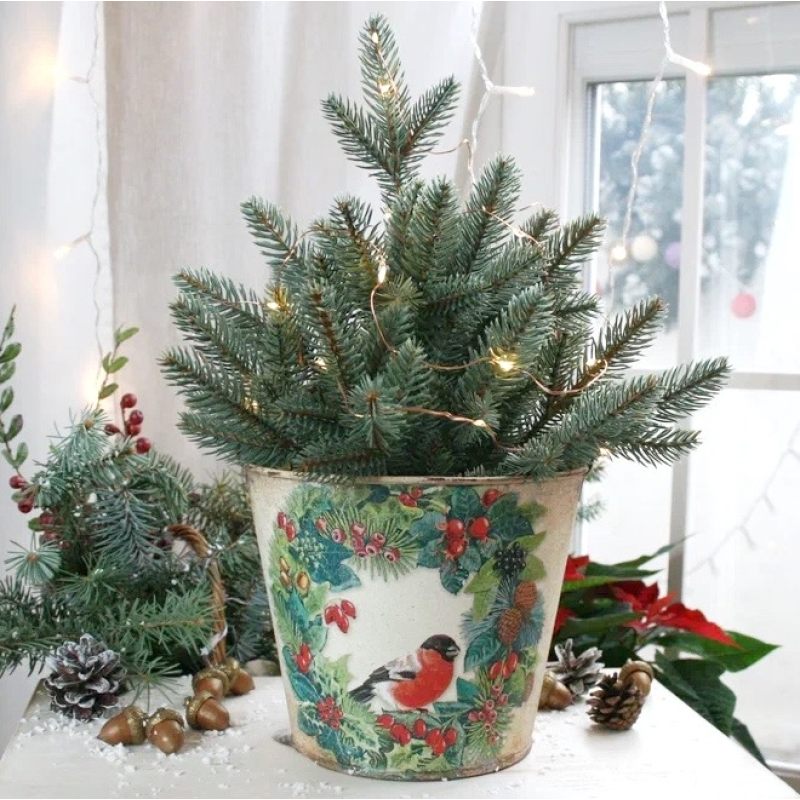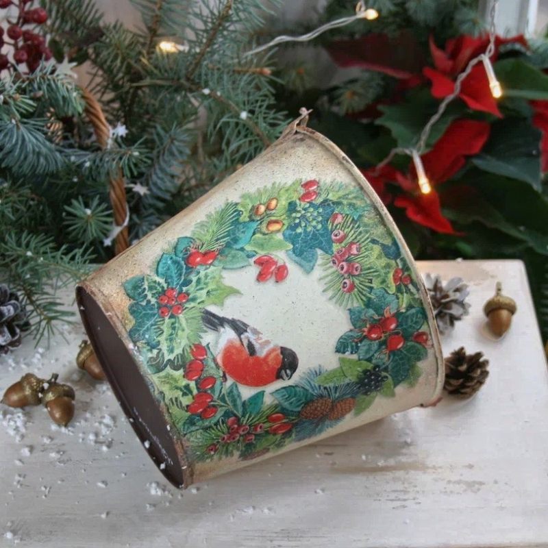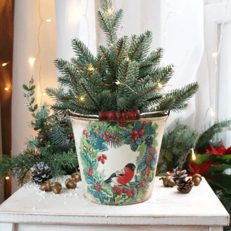 Ведёрко можно использовать для новогодних праздничных композиций с пуансеттией или ветками ели.