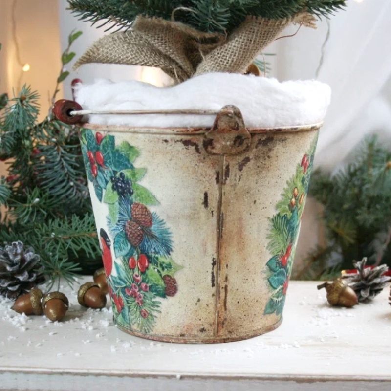 Ведёрко выполнено в технике декупаж в винтажном стиле. Многослойное матовое покрытие защищает от внешнего воздействия.