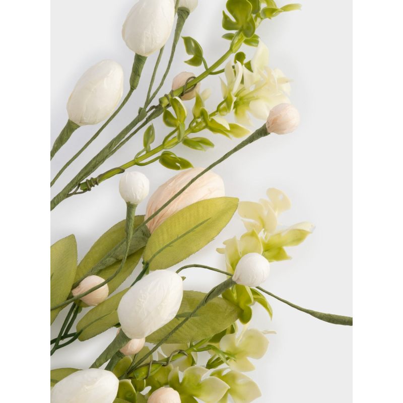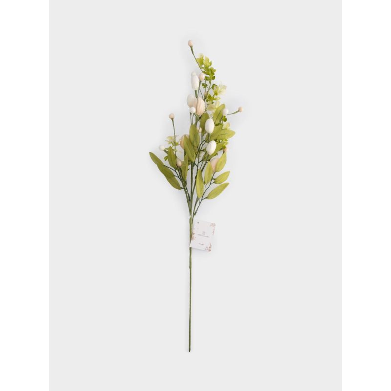 Эта изящная композиция словно соткана из первых лучей весеннего солнца и лёгкого шелеста пробуждающейся природы. Нежная ветка, украшенная яркими, словно расписанными вручную яйцами, приносит в дом атмосферу светлого пасхального праздника. Каждый элемент продуман до мелочей: натуральные оттенки зелени гармонично сочетаются с сочными цветами яиц — от нежно-розового до солнечно-жёлтого, от бирюзового до насыщенно-красного.